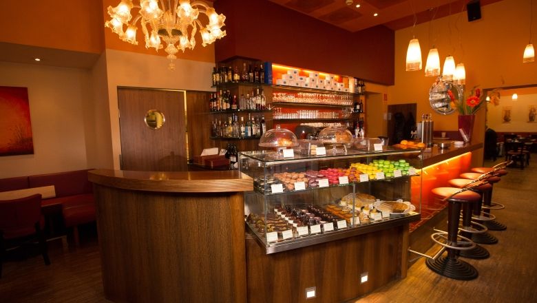 Kavárna a cukrárna Helmut & Helmut v Klostergasse v Sankt Pöltenu vítá své zákazníky prostorným vnitřním prostorem a za pěkného počasí i zahrádkou.