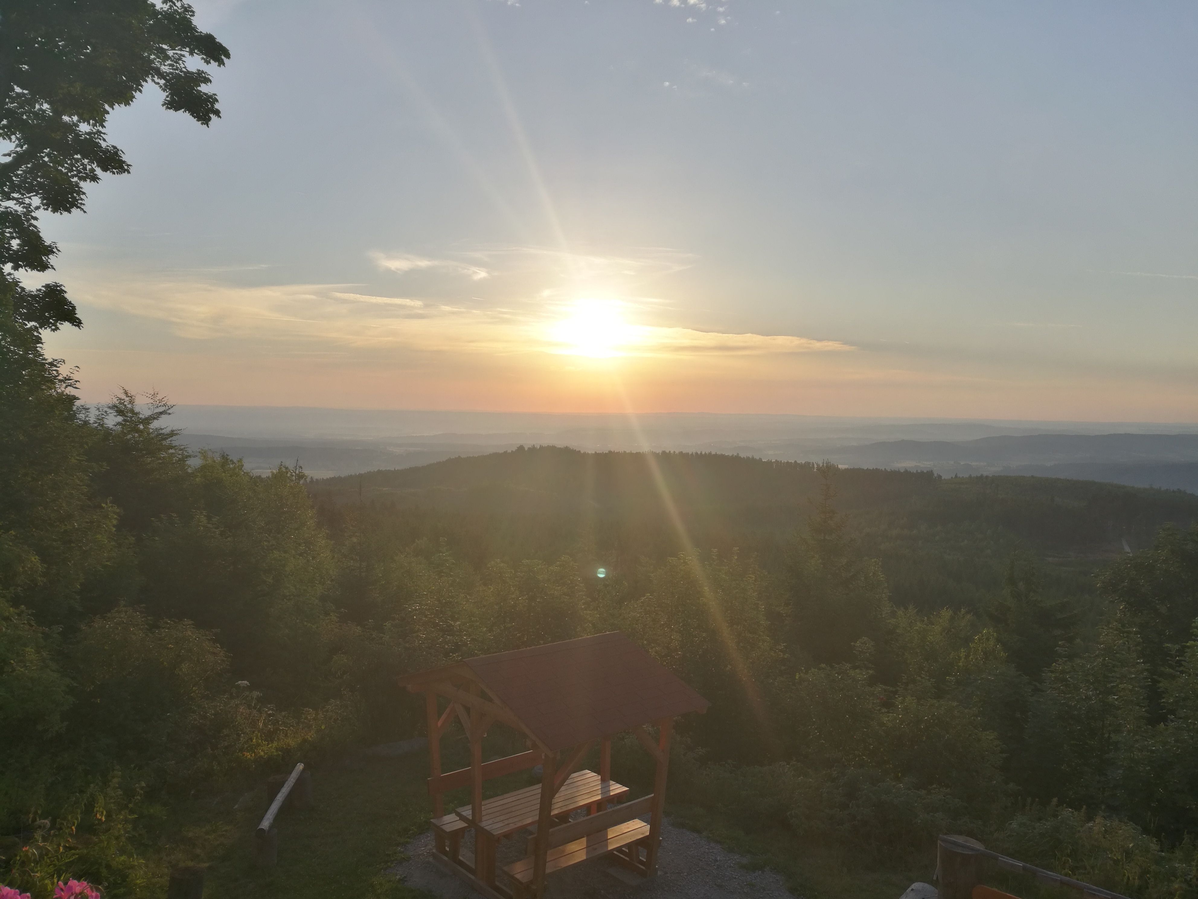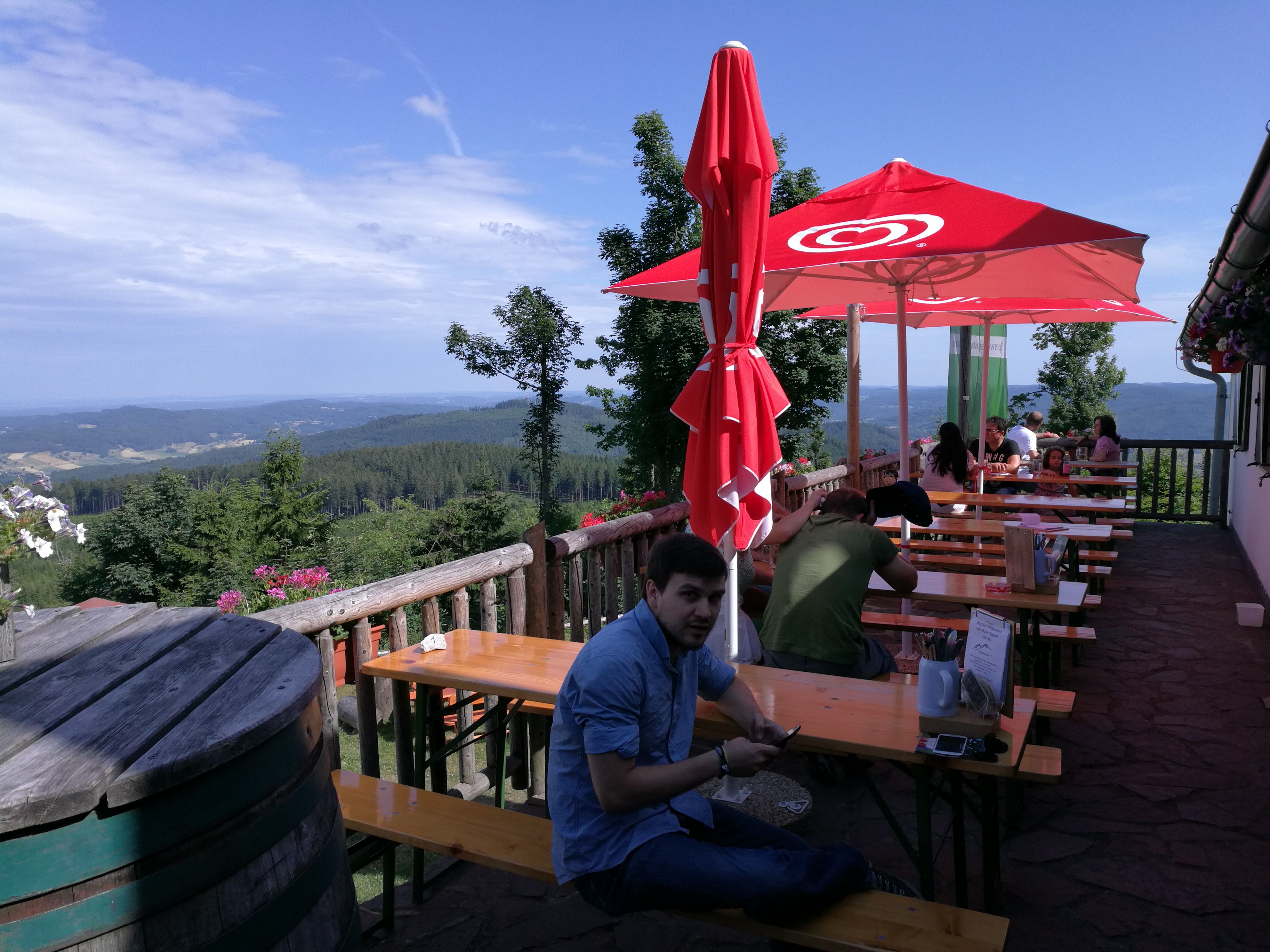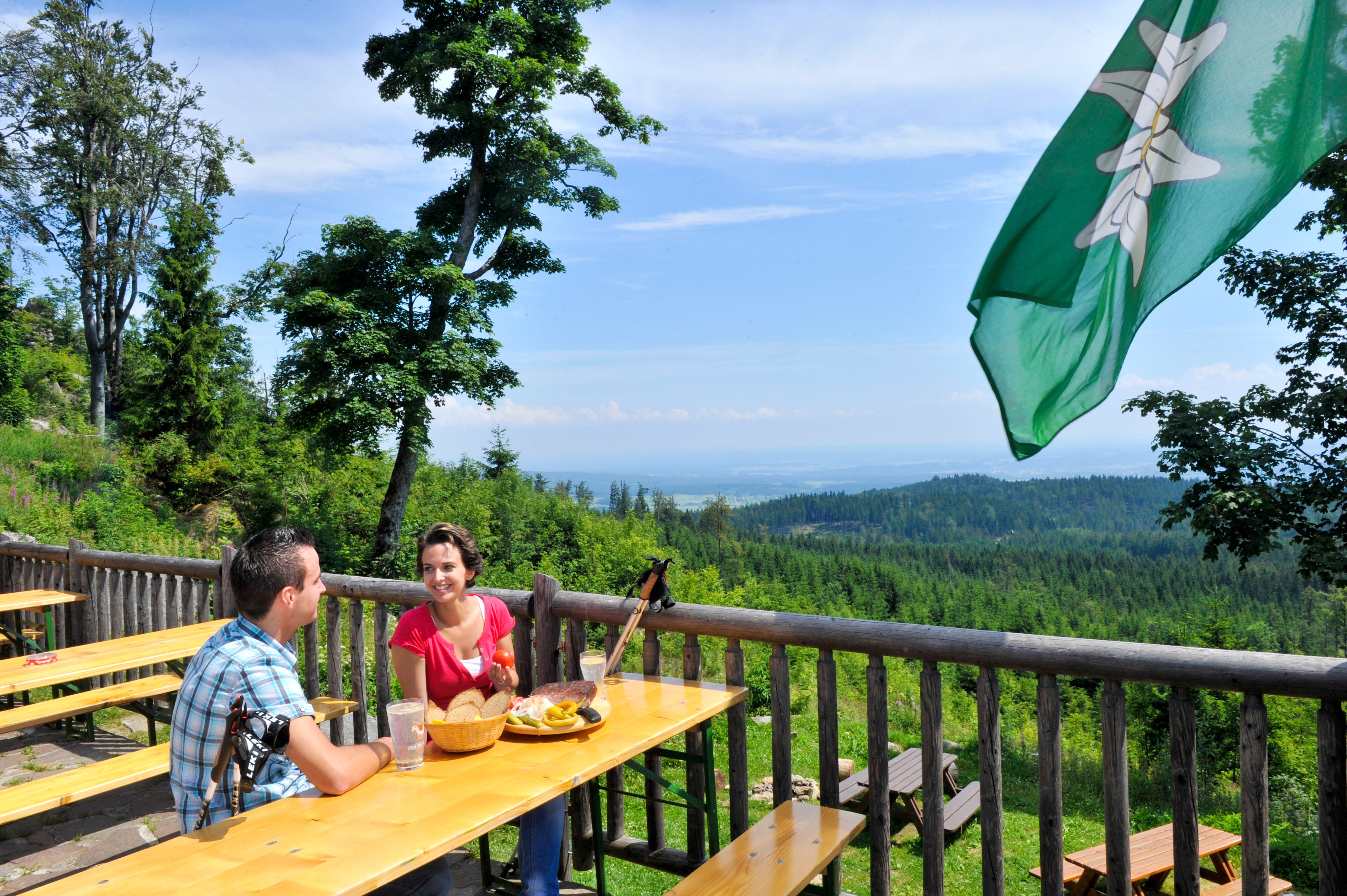 Nejen z vrcholu, ale i z terasy chaty, která je otevřena od dubna do října, se můžete kochat výhledem daleko do kraje.