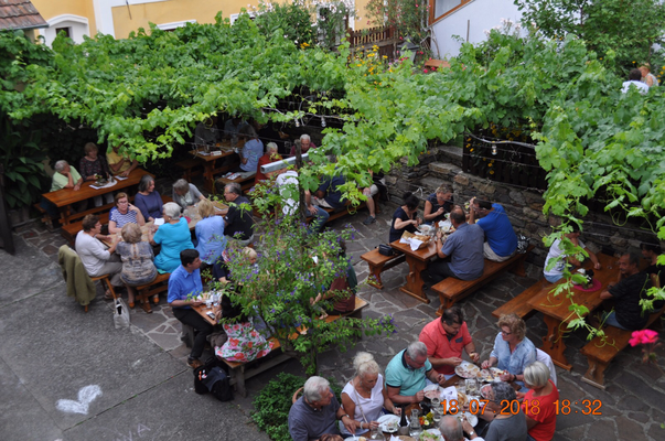 Vnitřní nádvoří, rámované vinnou révou a částečně kryté pergolou, nabízí příjemné klima pro vychutnávání vína z Wachau pod širým nebem až do pozdních večerních hodin.