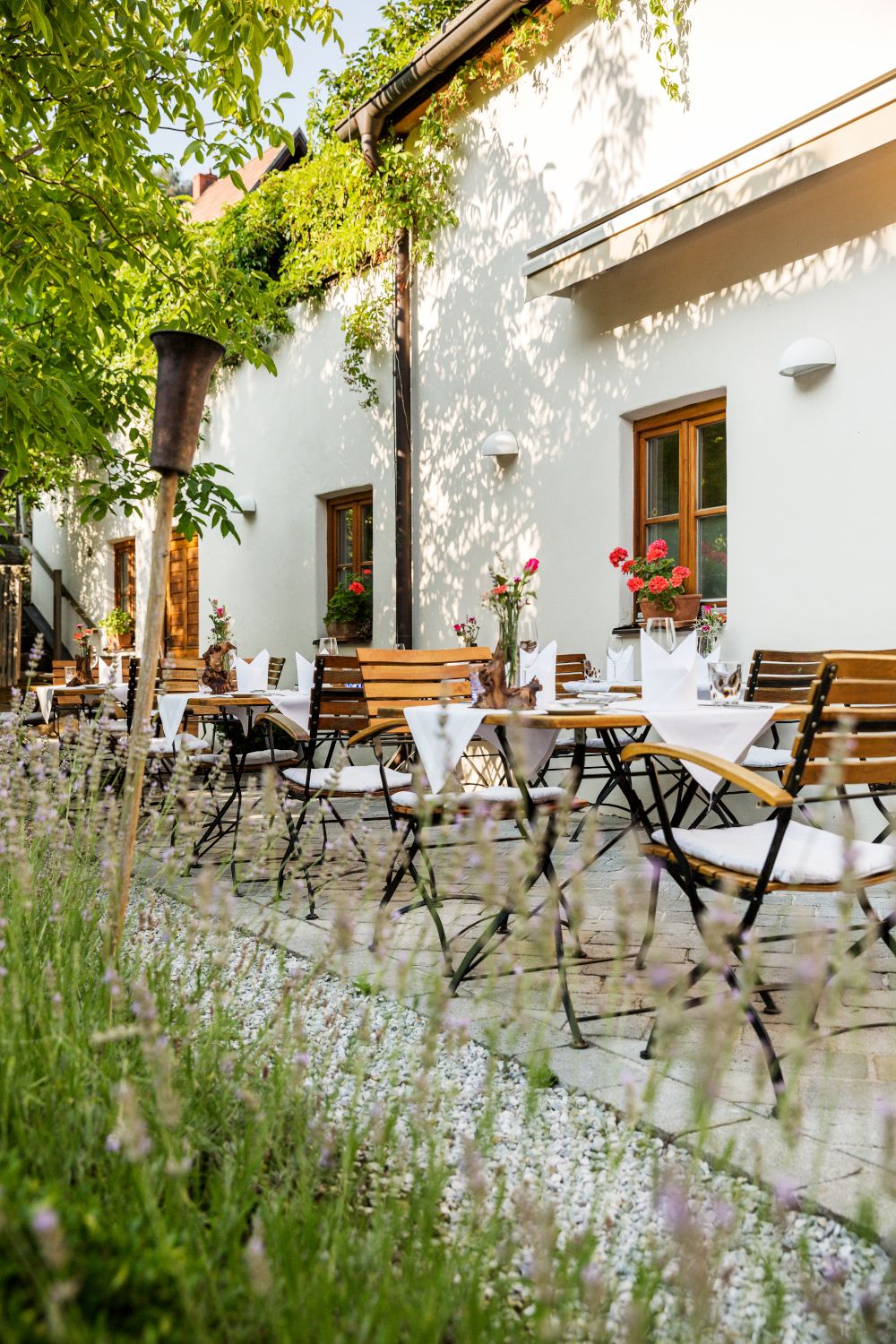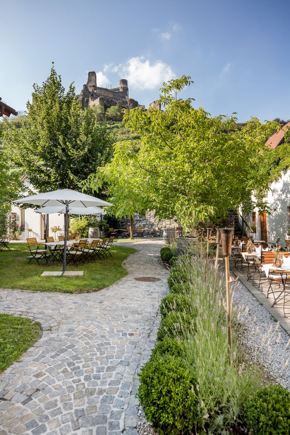 Umringt von Weingärten und historischen Mauern fühlt man sich in unserem Gutshof besonders wohl. Hier finden Gäste den passenden Rahmen für ein gediegenes Abendessen, unvergessliche Familienfeste, erfolgreiche Firmenfeiern, romantische Hochzeiten oder gemütliche Sonntagnachmittage. Die Räumlichkeiten bieten Platz für Gruppen bis zu 40 Personen. An schönen Tagen bietet sich der ruhige Gastgarten mit dem wunderbaren Blick zur Ruine zum Verweilen an.