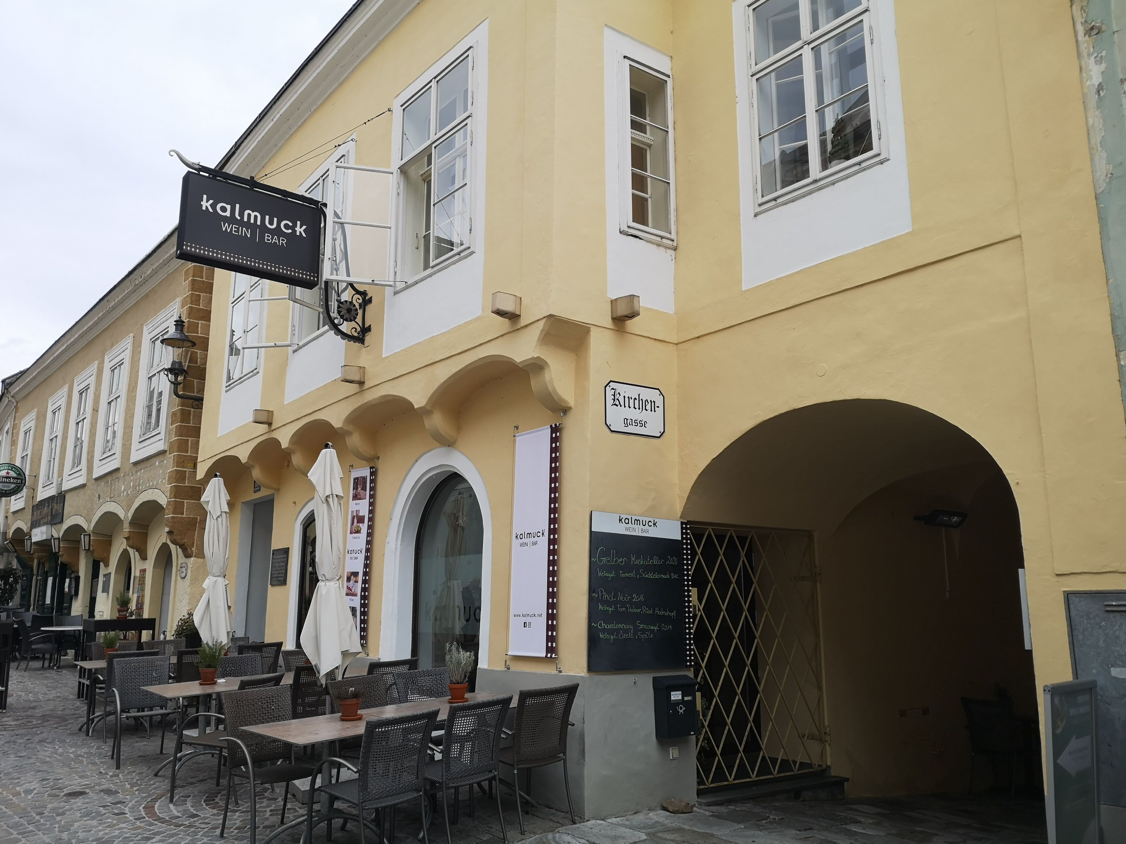 Pohled na žlutou budovu s nápisem "Kalmuck Wein Bar" zvenčí. Před budovou jsou stoly a židle.