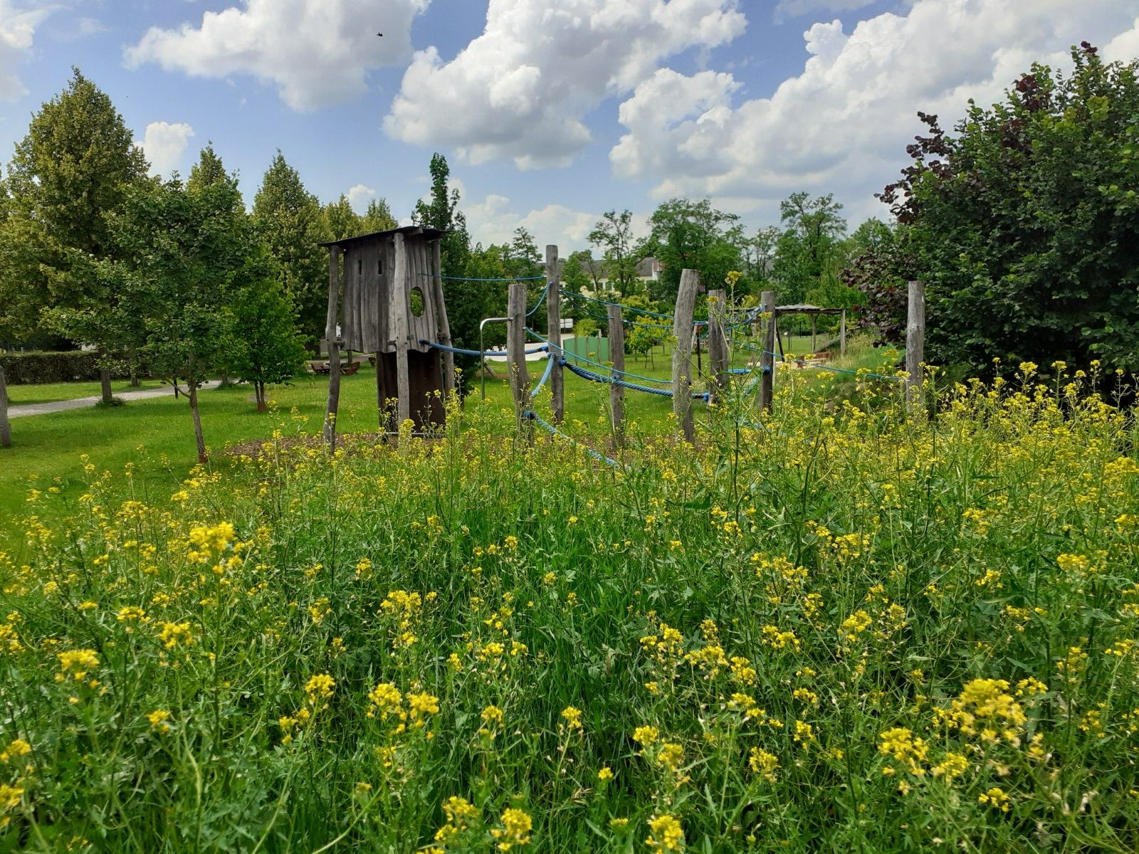 Prostorné hřiště pro malé i starší děti. Létající liška, skluzavka, vodní hrátky, houpačky, lanové zábradlí, kopec a velká zelená plocha. Na dětském hřišti není co řešit. Uprostřed aleje stromů jsou k dispozici lavičky a stoly pro krátkou přestávku a občerstvení.