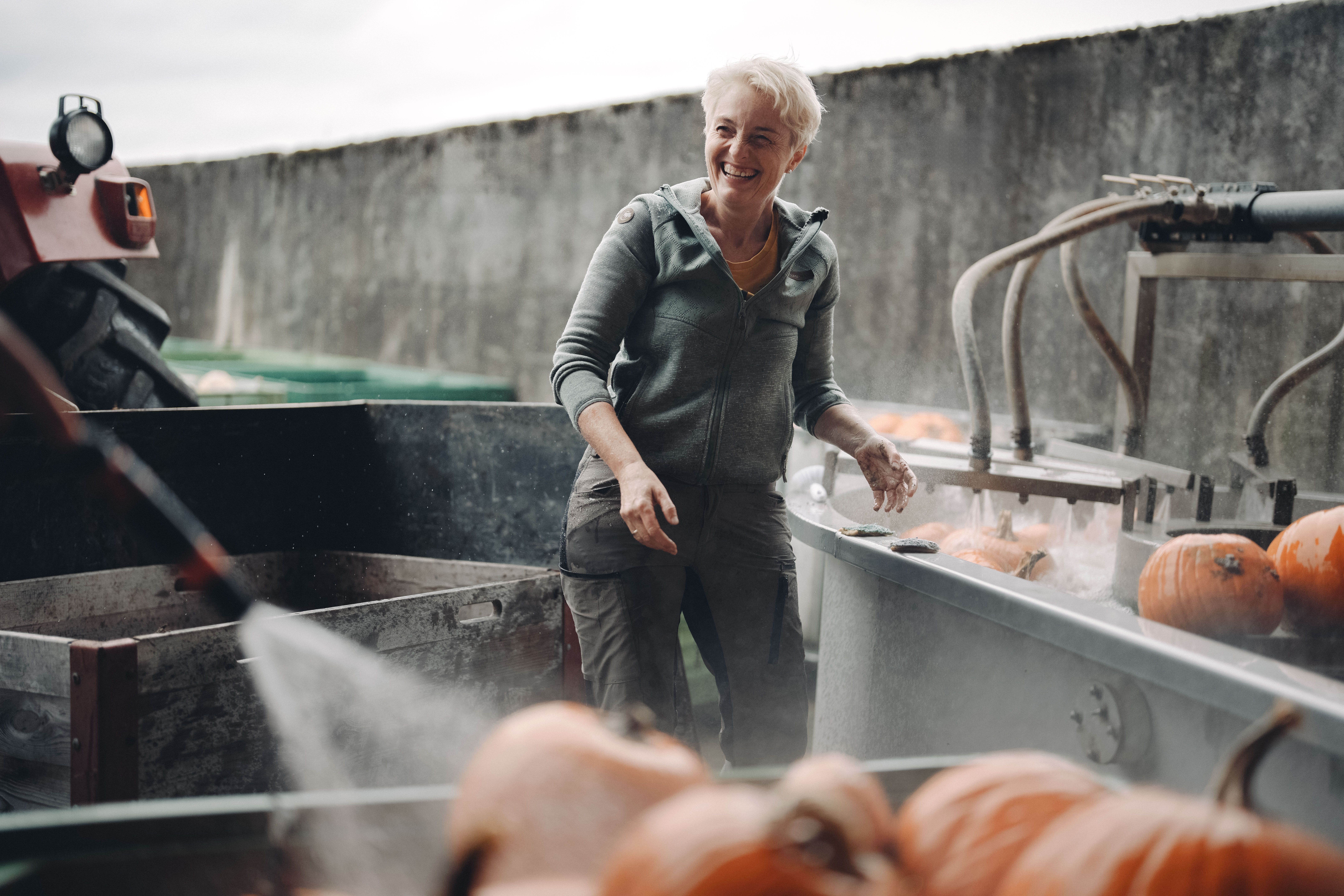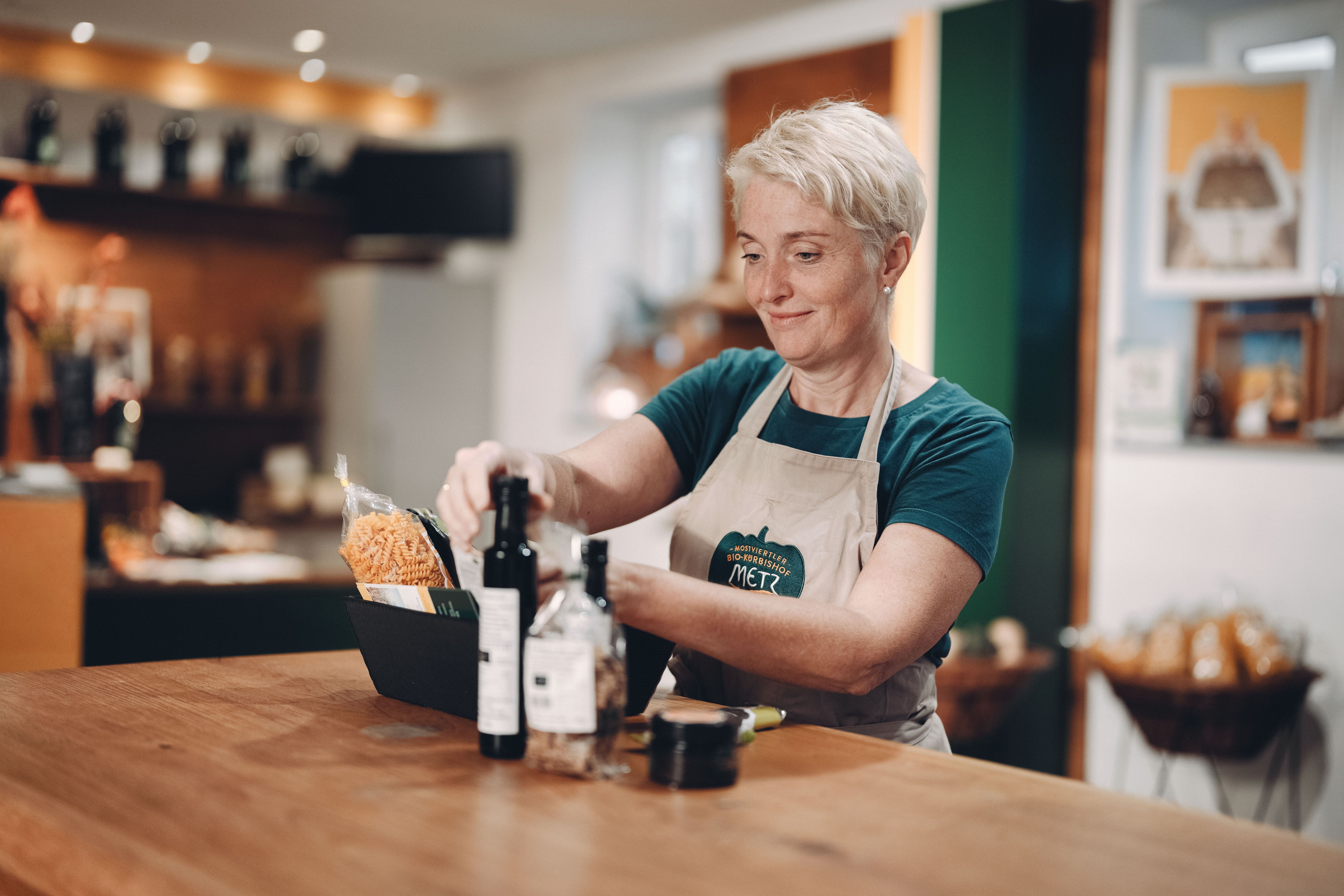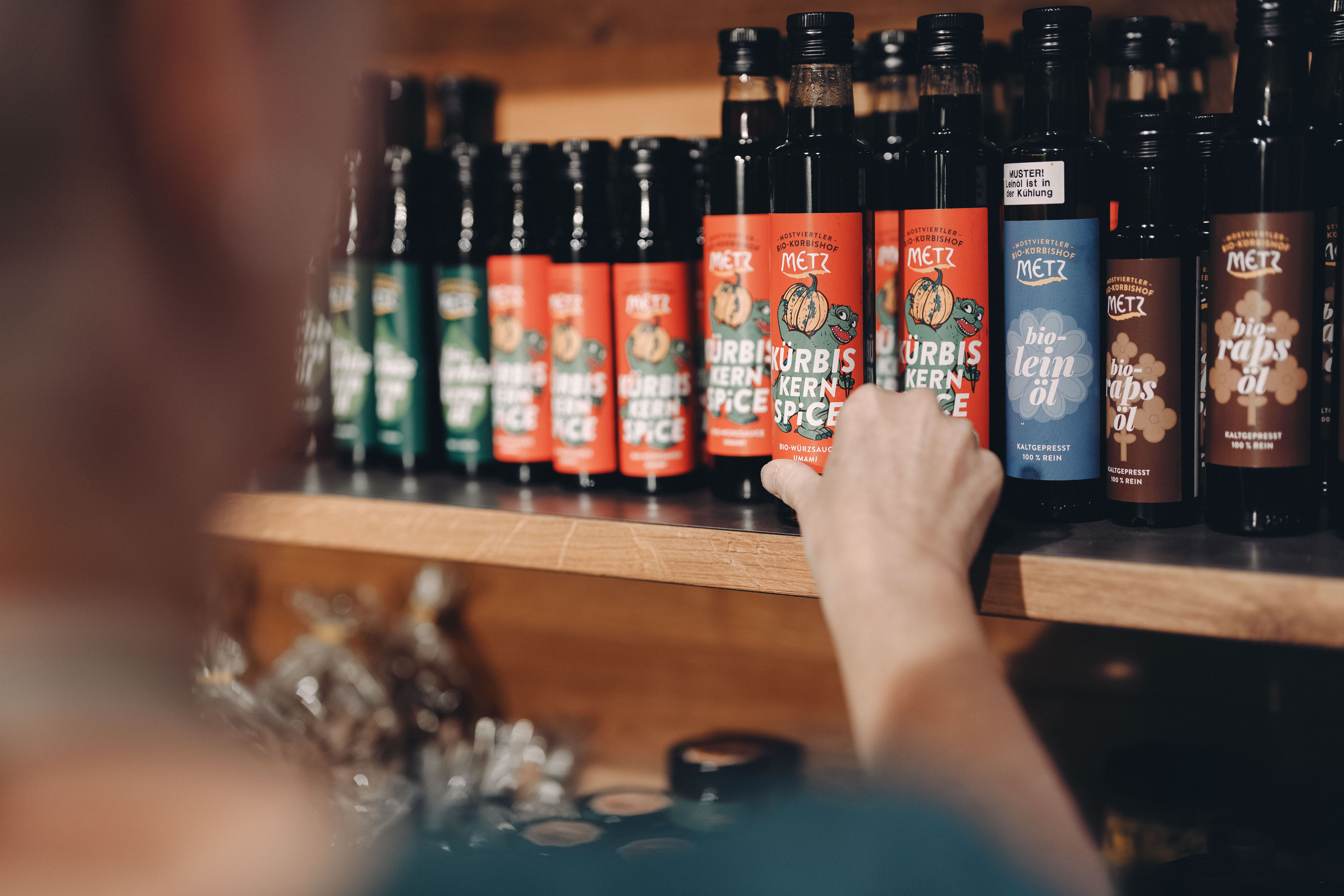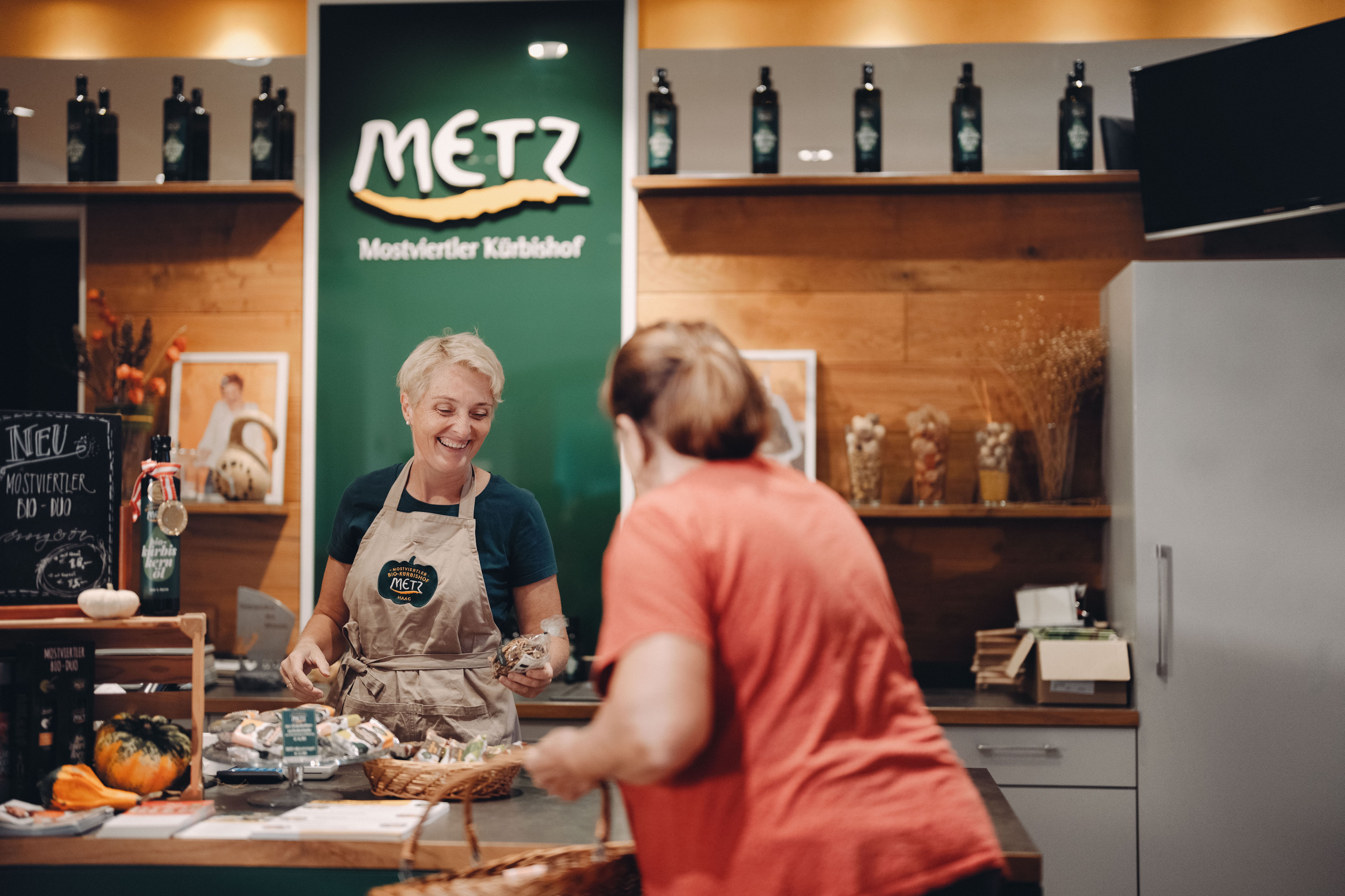Prodejna dýní na farmě Kürbishof Metz je otevřena celoročně a prodává četné produkty z dýní z vlastní produkce - doplněné za studena lisovaným bio lněným olejem a bio řepkovým olejem.