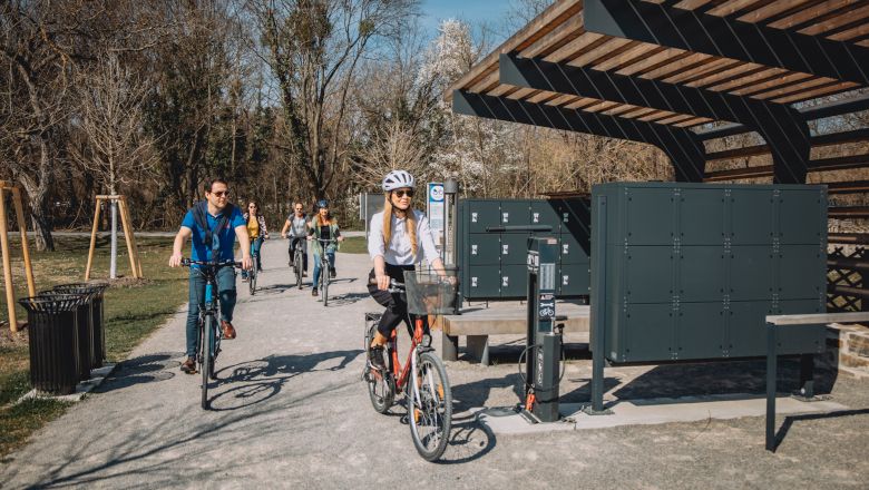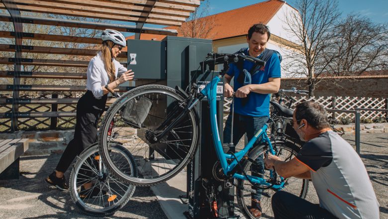 Před hlavním vchodem do zámku Schloss Hof se nachází stanice pro kola s parkovacími místy, skříňkami s možností nabíjení, opravárenskou/servisní stanicí a lavičkou k odpočinku.