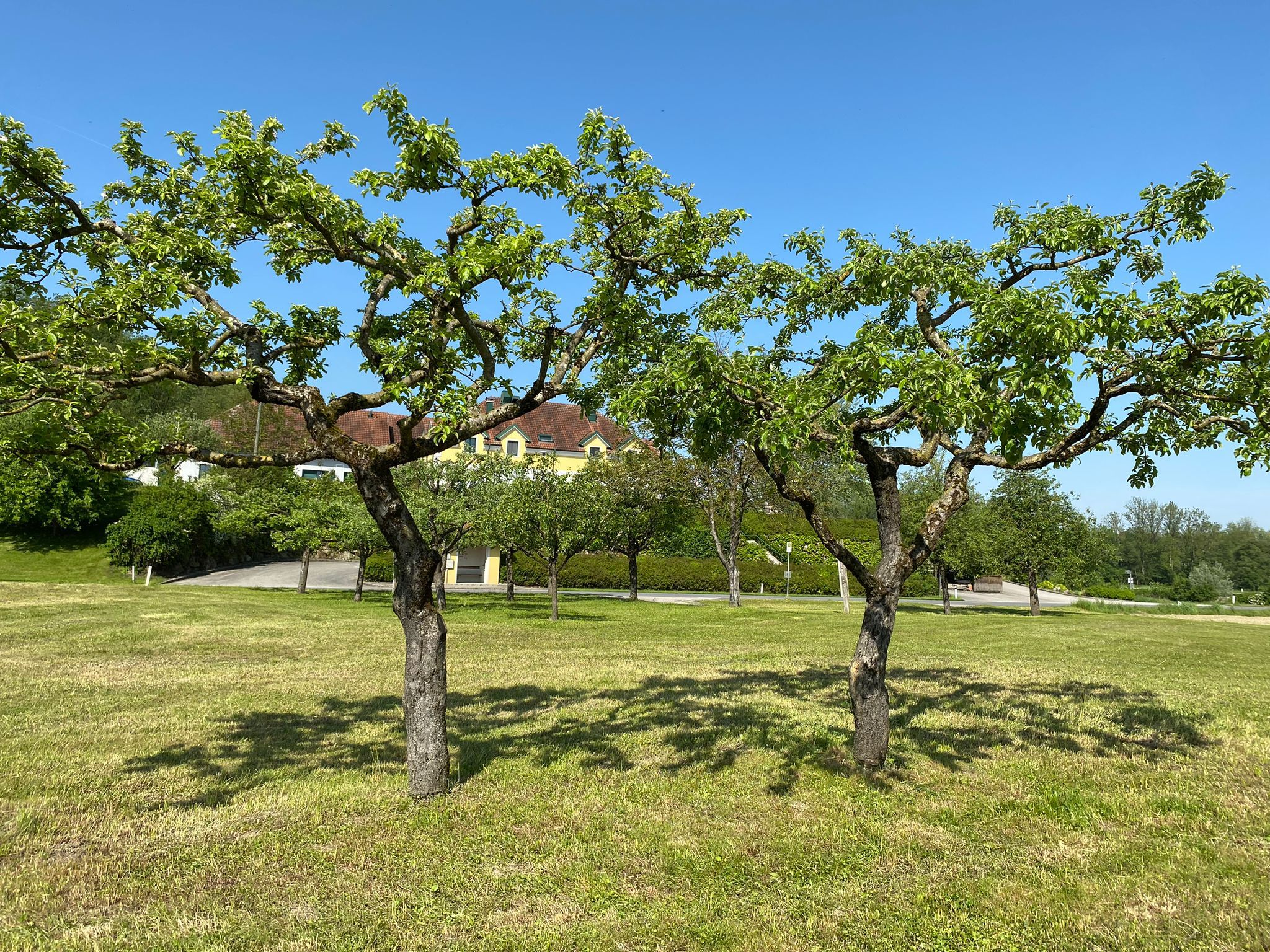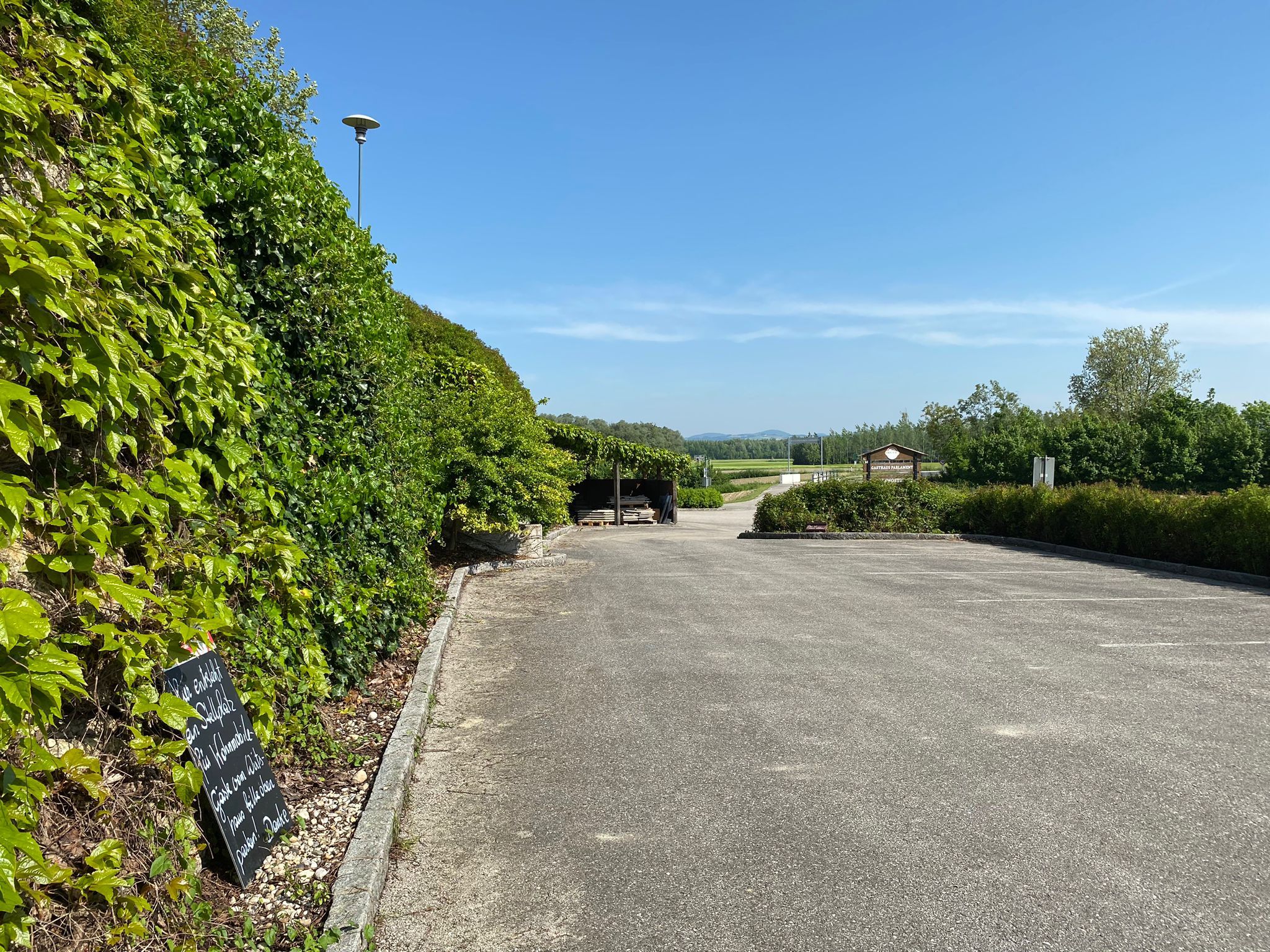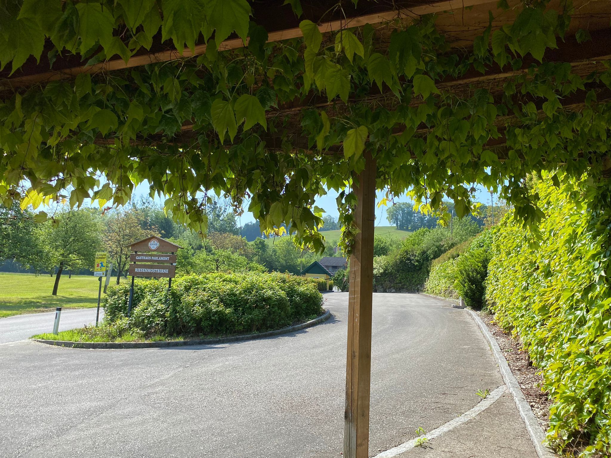 Stanoviště na parkovišti Parlamentwirt, uprostřed dunajské krajiny, přímo na Dunajské cyklostezce, před hostincem stojí "Mostviertler Riesenmostbirne" - symbol Mostviertelu.