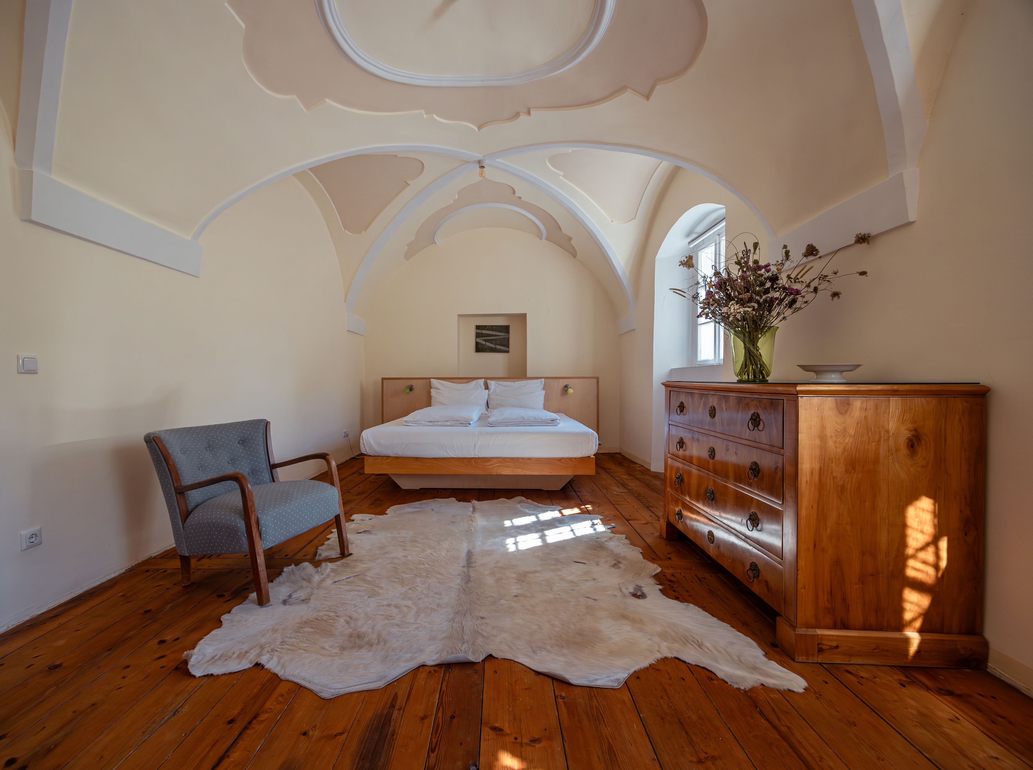 Tento historický objekt pochází z 15. století. A protože takový dům s tak dlouhou historií s sebou nese i velkou odpovědnost, rozhodli se majitelé otevřít jeho novou kapitolu – a přivítat hosty v nových pokojích. Při přestavbě se spojily vzdušné prostory a čisté linie s barokní hravostí a charismatickými solitéry. Hosté tu rádi zůstávají přes noc, užívají si atmosféru, nově vybudované koupací jezírko v zámecké zahradě, fantastickou kuchyni a výtečná vína, která se na statku vyrábějí podle zásad biodynamiky.