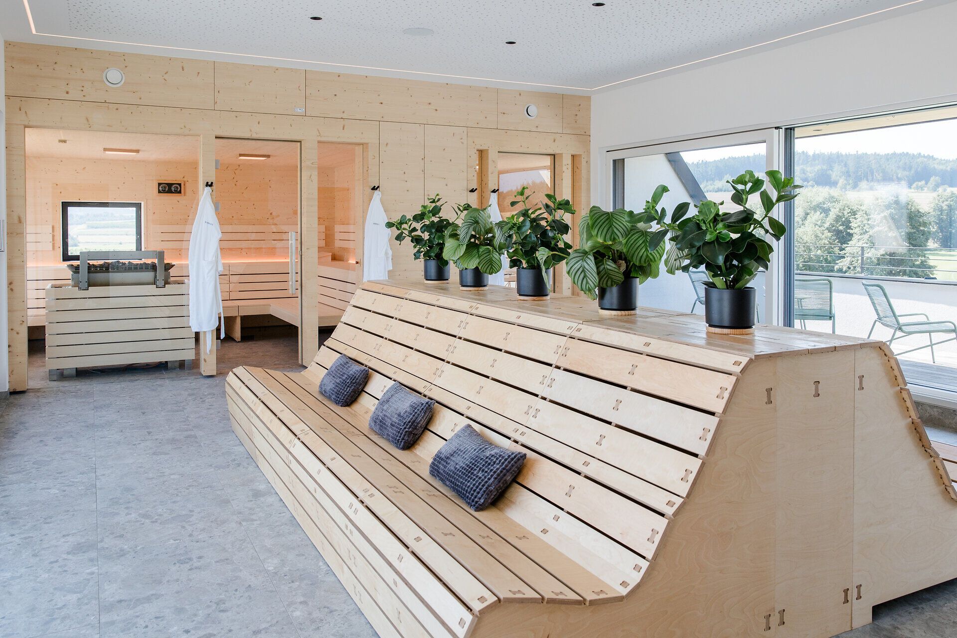 Po aktivním pobytu v přírodě vás k odpočinku vybízí střešní wellness centrum se dvěma saunami a útulnými relaxačními místnostmi. Čtyři střešní terasy navíc nabízejí fantastický výhled na golfové hřiště Ottenstein a působivou okolní krajinu.