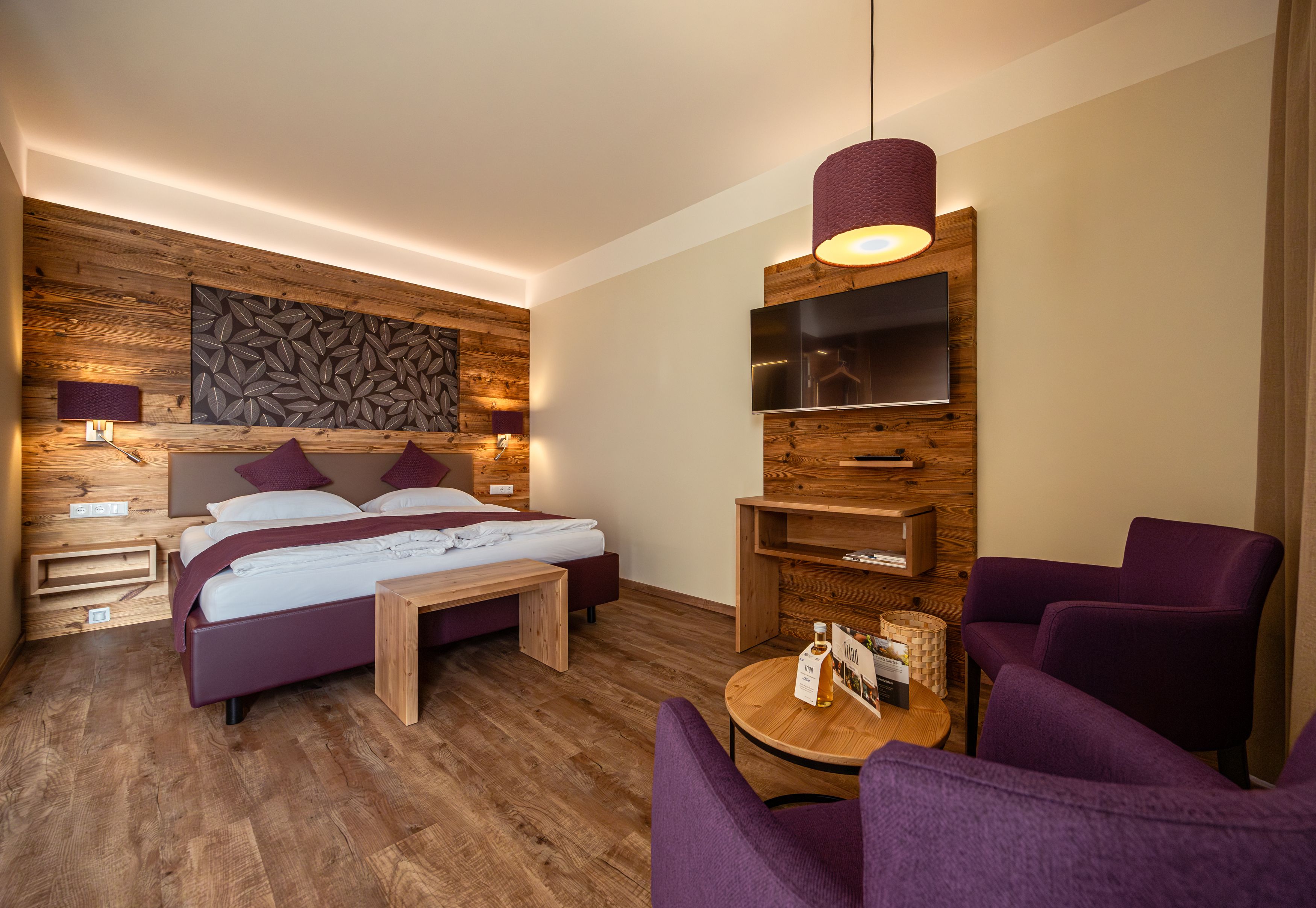 Na zeleném kopci trůní pět originálních postelí „in der Wies’n“ – s poetickými názvy jako „Auf da Teichseit’n“ (U rybníčku) nebo „„Im Gartl“ (V zahrádce). Velkorysé prosklené stěny těchto moderních dřevostaveb otevírají pohled na rozmanitou krajinu, aniž byste museli vstát z postele. Ideální místo pro chvíle ve dvou, kdy vás ráno místo budíku probudí sluneční paprsky. Ale i tak se vyplatí občas vstát z postele a vydat se poznávat pohoří Bucklige Welt po jeho četných turistických stezkách. Tip: V penzionu Triad najdete dalších šest nových dvoulůžkových pokojů uprostřed přírody – hned vpravo vedle vlastní restaurace ověnčené kuchařskými čepicemi.