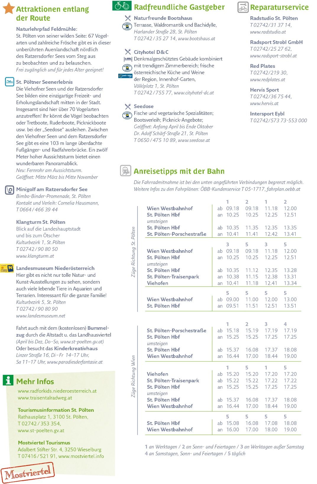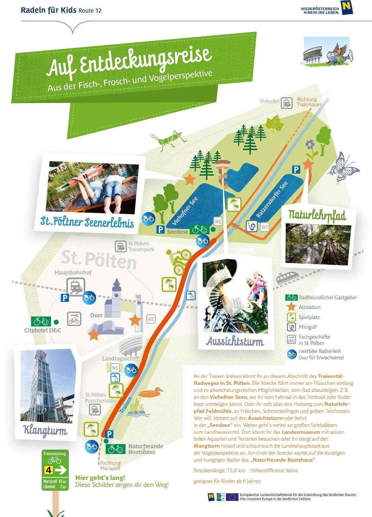 Na tomto úseku Cyklostezky Traisental-Radweg v St. Pöltenu se můžete projet na kole podél řeky Traisen. Trasa vede vždy podél malé říčky a nabízí řadu příležitostí k sesednutí z kola. Například u Viehofnerských jezer, kde můžete přesednout z kola na šlapadlo nebo veslici. Nebo se můžete přetočit přes dřevěnou lávku na naučnou stezku Feldmühle za žábami, motýly a žlutými lekníny.