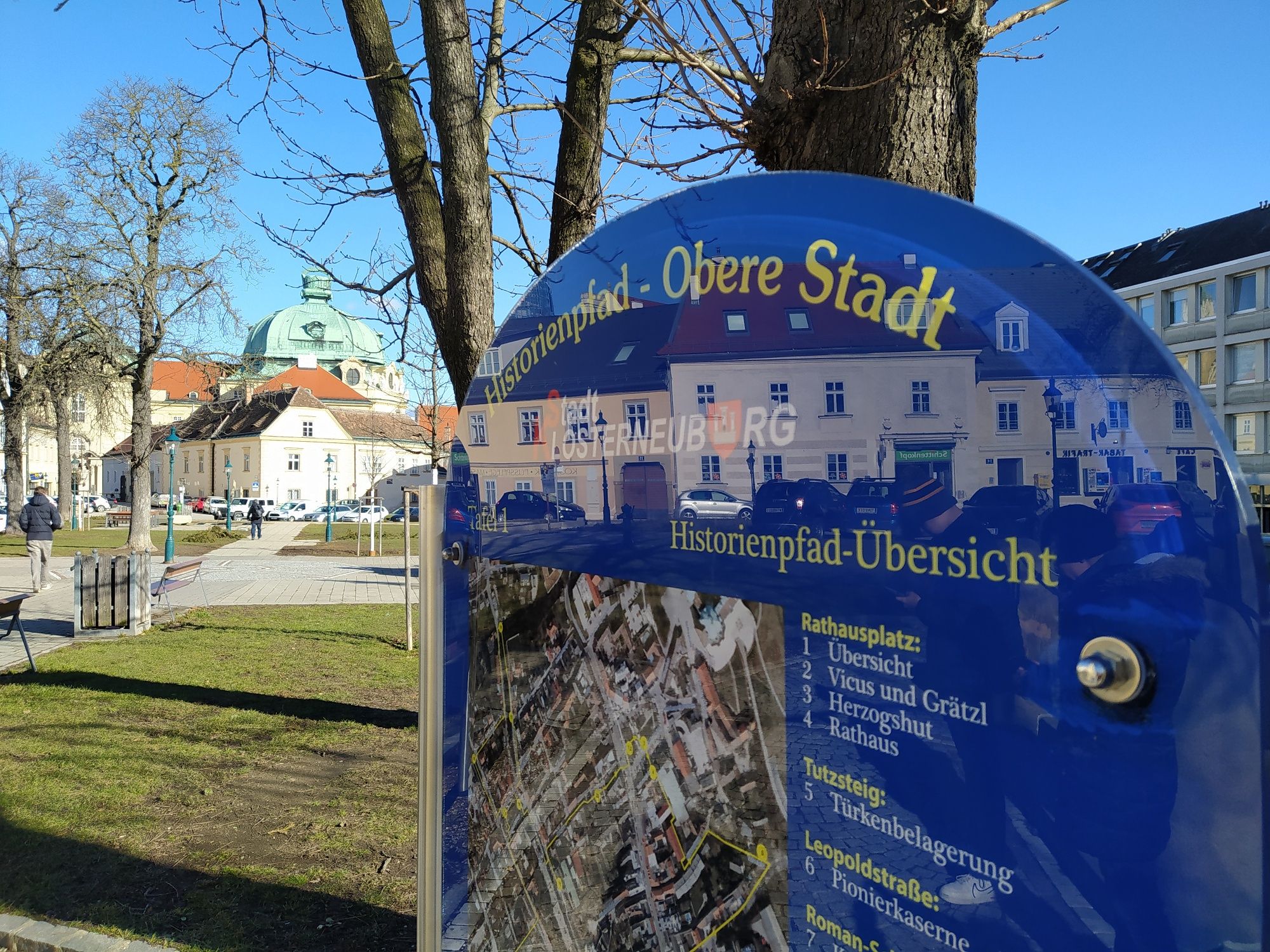 "Stezka historie - Horní město" je pokračováním stávající stezky v Dolním městě. Na 20 zastaveních se dozvíte o historických událostech, osobách a budovách. Tato trasa dlouhá přibližně 3 kilometry nabízí návštěvníkům i místním obyvatelům pohled do minulosti Klosterneuburgu.