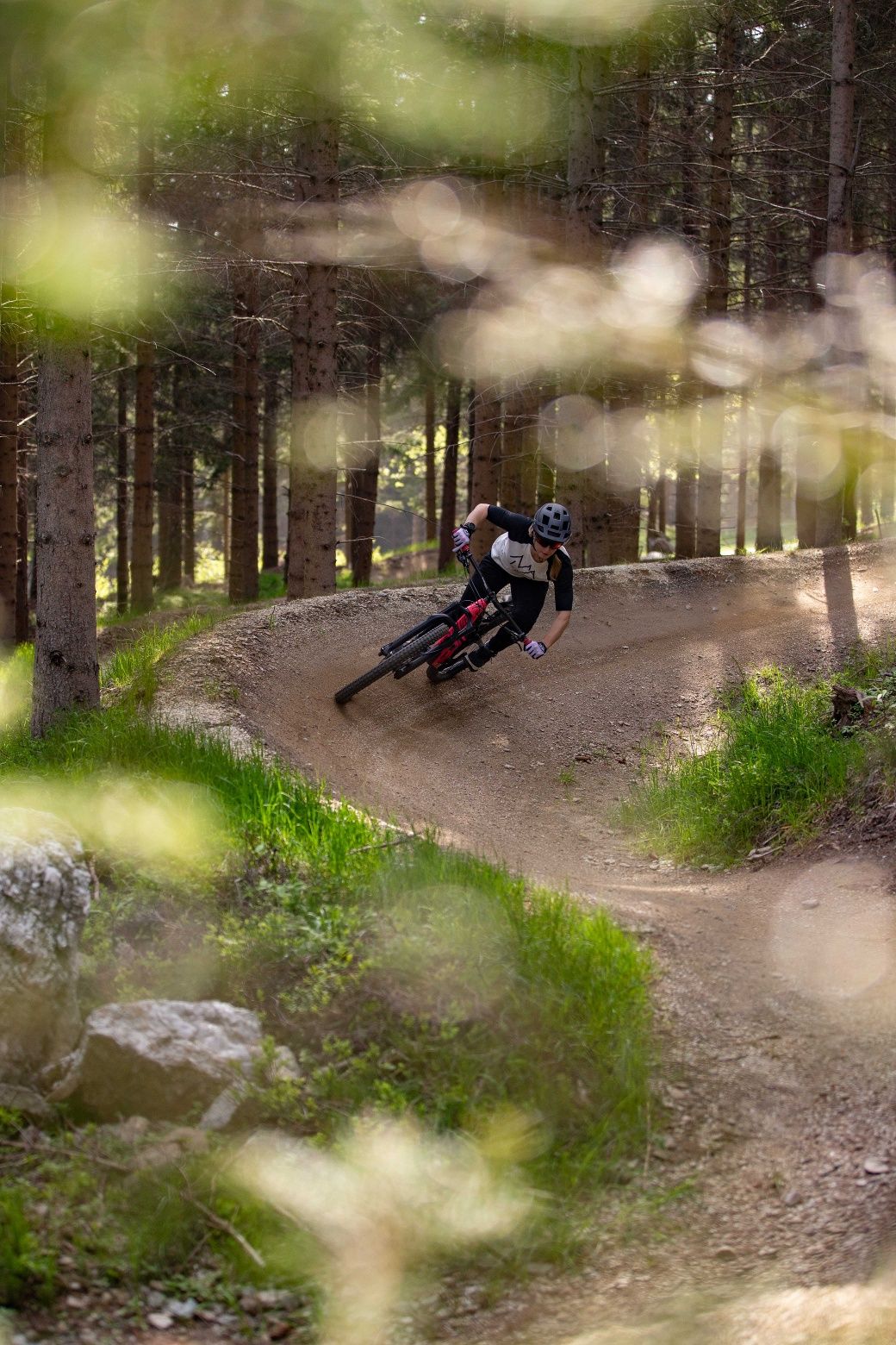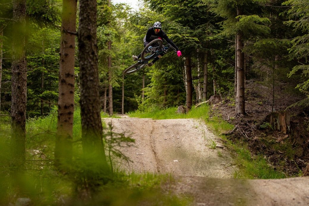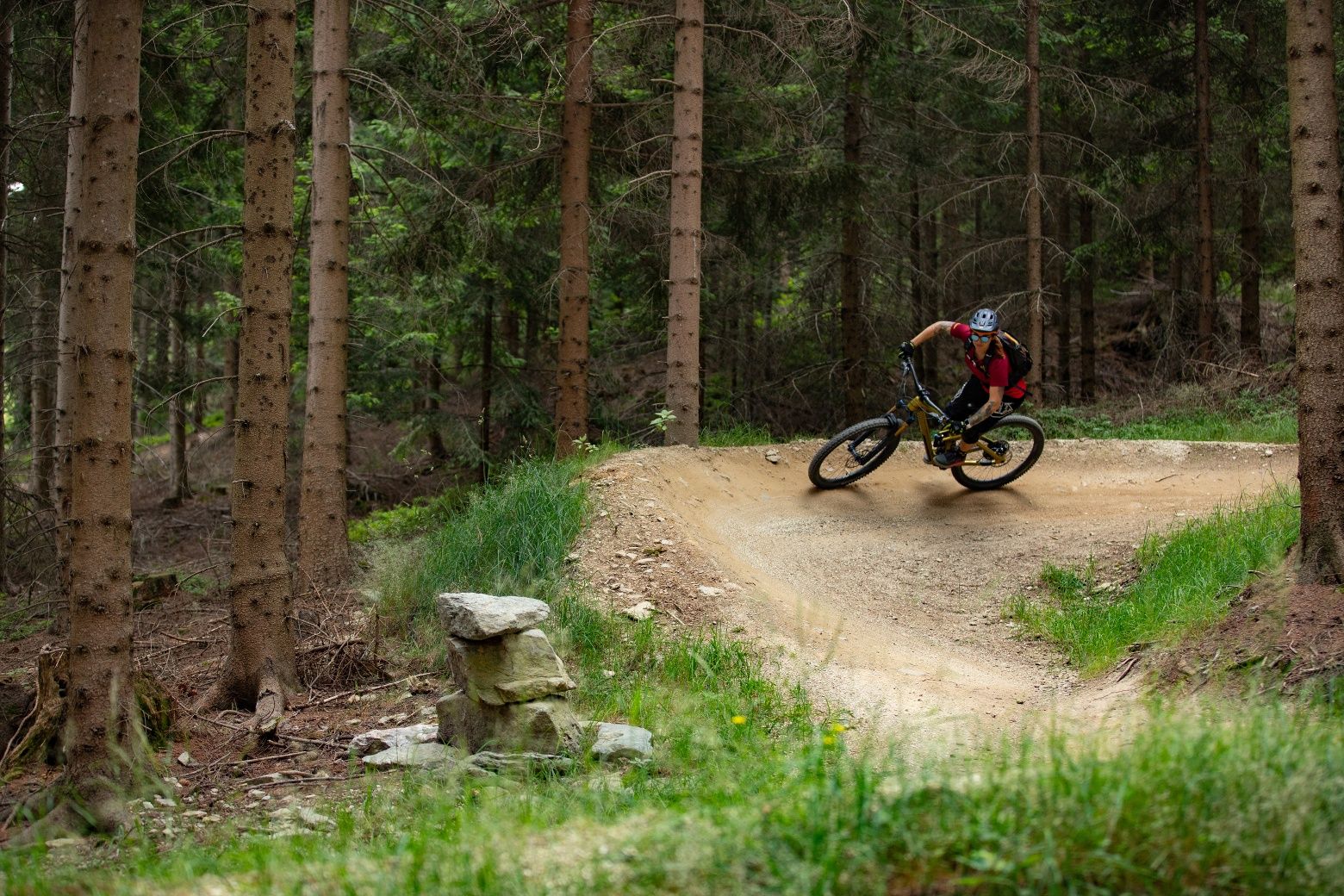 Plynulá stezka bez kořenů a kamenů, ideální pro e-mountain bikery, začátečníky a děti.