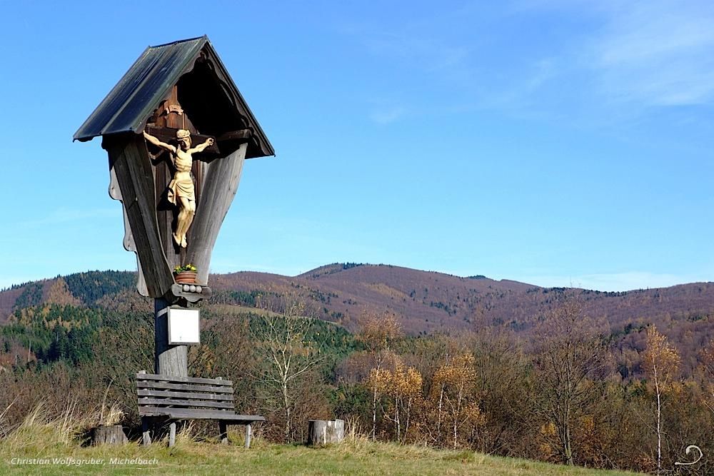 V malém obchůdku Susi's se zásobte potravinami a vydejte se po asfaltové cestě mezi Gasthof zur Glashütte a zahradou pro hosty. Po 150 metrech odbočíme vlevo na neznačenou cestu a jdeme do kopce podél typického vídeňského příkopu. Před smrkovým hájem se cesta mírně stáčí doleva a brzy se nám odhalí malebné statky Klein- a Großleiten. Projdeme kolem nich a držíme se vozové cesty, kolem vodní nádrže a nahoru k "Červenému kříži". Po bílo-zeleno-bílém značení na západě vede cesta směrem na Stollberg (rozcestník), přejdeme lesní cestu a vynoříme se tmavým smrkovým lesem na louku Hirschbach, kde nás mezi dvěma modříny čeká "Černý kříž". Pokračujeme po panoramatickém hřebeni kolem krásného solitérního dubu, až polní cesta odbočí vlevo těsně před Stollberger-Anhöhe, kde odbočíme vpravo dolů k hostinci Gasthof Kreuzwirt.