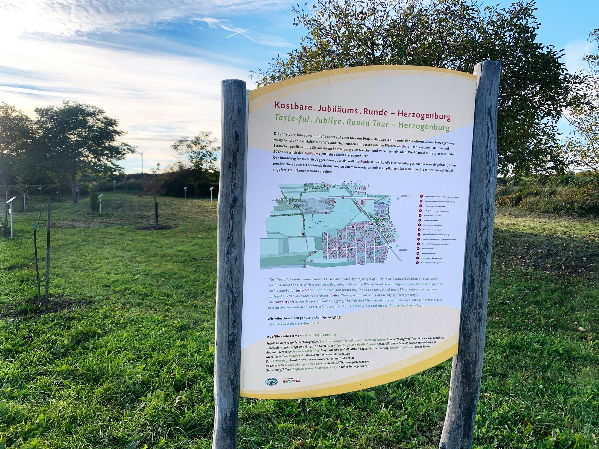 Procházka, která vznikla jako projekt zapojení občanů u příležitosti 90. výročí založení města a kterou provázejí ovocné stromy a keře nedaleko centra města, splňuje několik aspektů. Především má podpořit setkávání a pohyb v kultivované krajině v blízkosti centra města a prostřednictvím značení zprostředkovat zajímavé ekologické poznatky o samotných odrůdách a hmyzím světě. Dárkové stromy k výročím obyvatel vytvořily počáteční vztah ke stromům. Stinná odpočinková místa na kamenné zídce nebo pod starými stromy nabízejí možnost prožít změny v ročním cyklu od voňavých květů na jaře až po první dozrávání některých zdánlivě exotických plodů. Májové bobule, indiánské banány, srdcovky, švestky bez pecek a podobně čekají na to, až je budete jíst a milovat.
