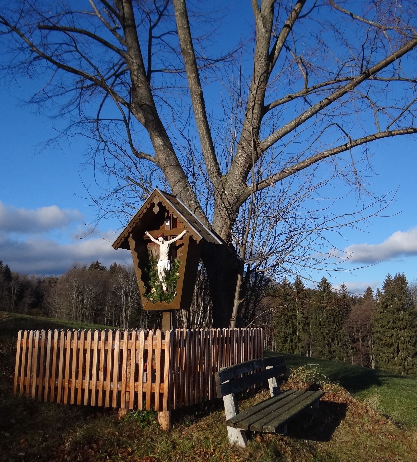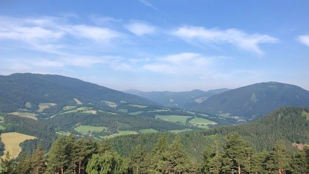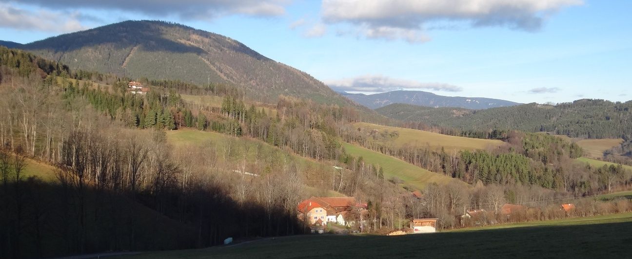 Po této cestě jdeme až do další ostré zatáčky vpravo, za níž nás žlutá značka nasměruje doleva, kde jdeme poměrně prudce do kopce po okraji pole. Nakonec dojdeme ke kapličce u cesty s lavičkou, kde si můžeme dopřát první zasloužený odpočinek a pokochat se výhledem na Kirchberg a jeho dva kostely. Nyní jdeme chvíli po asfaltové cestě, dokud nedojdeme ke "Kreuzbauern", po které vstoupíme do lesa na lesní cestu. Brzy dojdeme na rozcestí. To vlevo vede ke Steyersberger Schwaig, to úplně vpravo zpět dolů do údolí. My si vybereme prostřední cestu se žlutým značením. Po této již vzrostlé lesní cestě pak putujeme poměrně dlouho. Nakonec vyjdeme z lesa a přejdeme přírodní přehradu, takzvanou "Holzgasse", která je již v údolí Alpltal. I zde láká lavička k odpočinku. I zde máte před sebou vydru a krásné výhledy na Rax.
