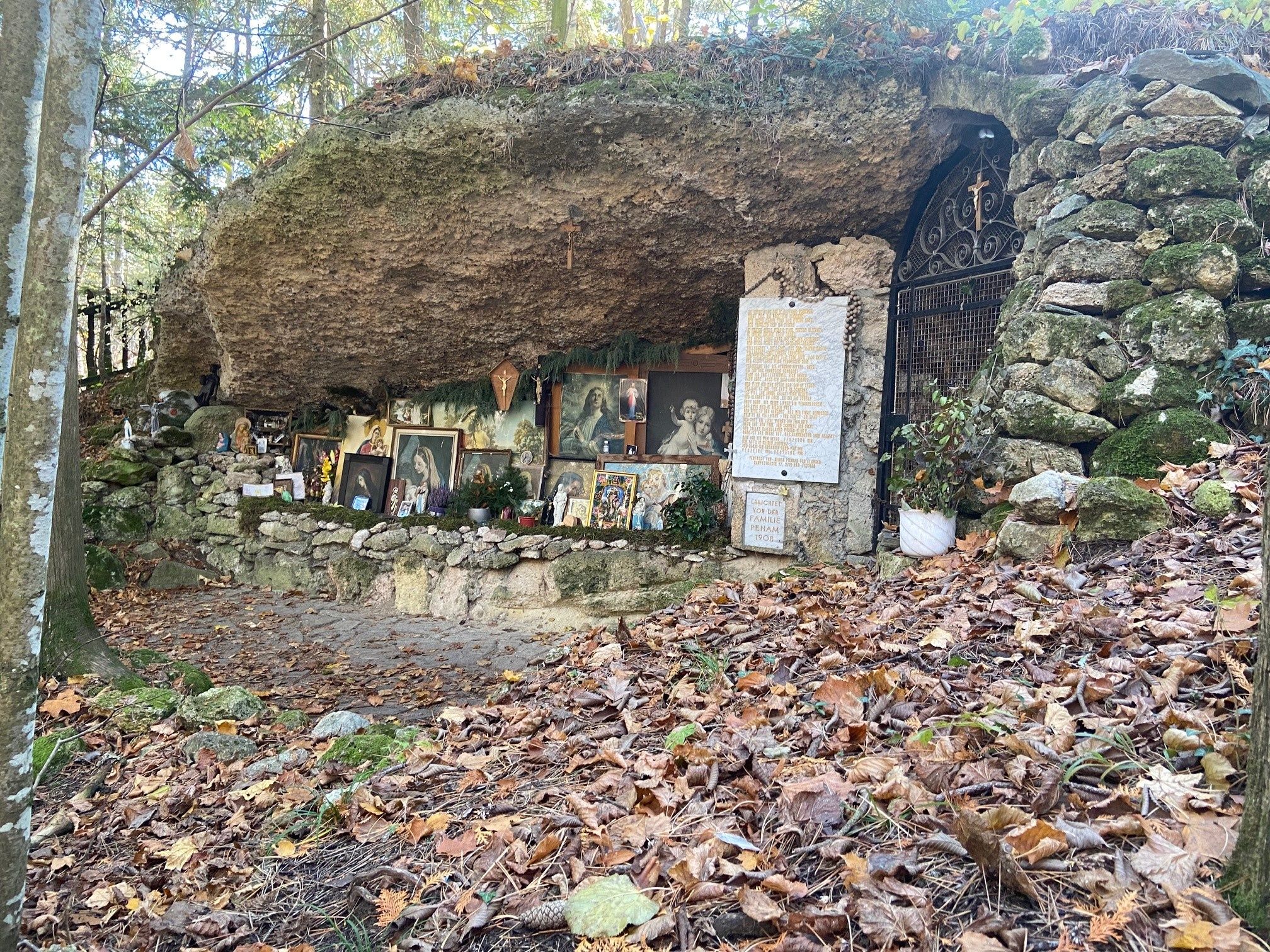 Nenáročná okružní trasa z Bad Fischau borovým lesem k lesní pobožnosti a železokamenné jeskyni.