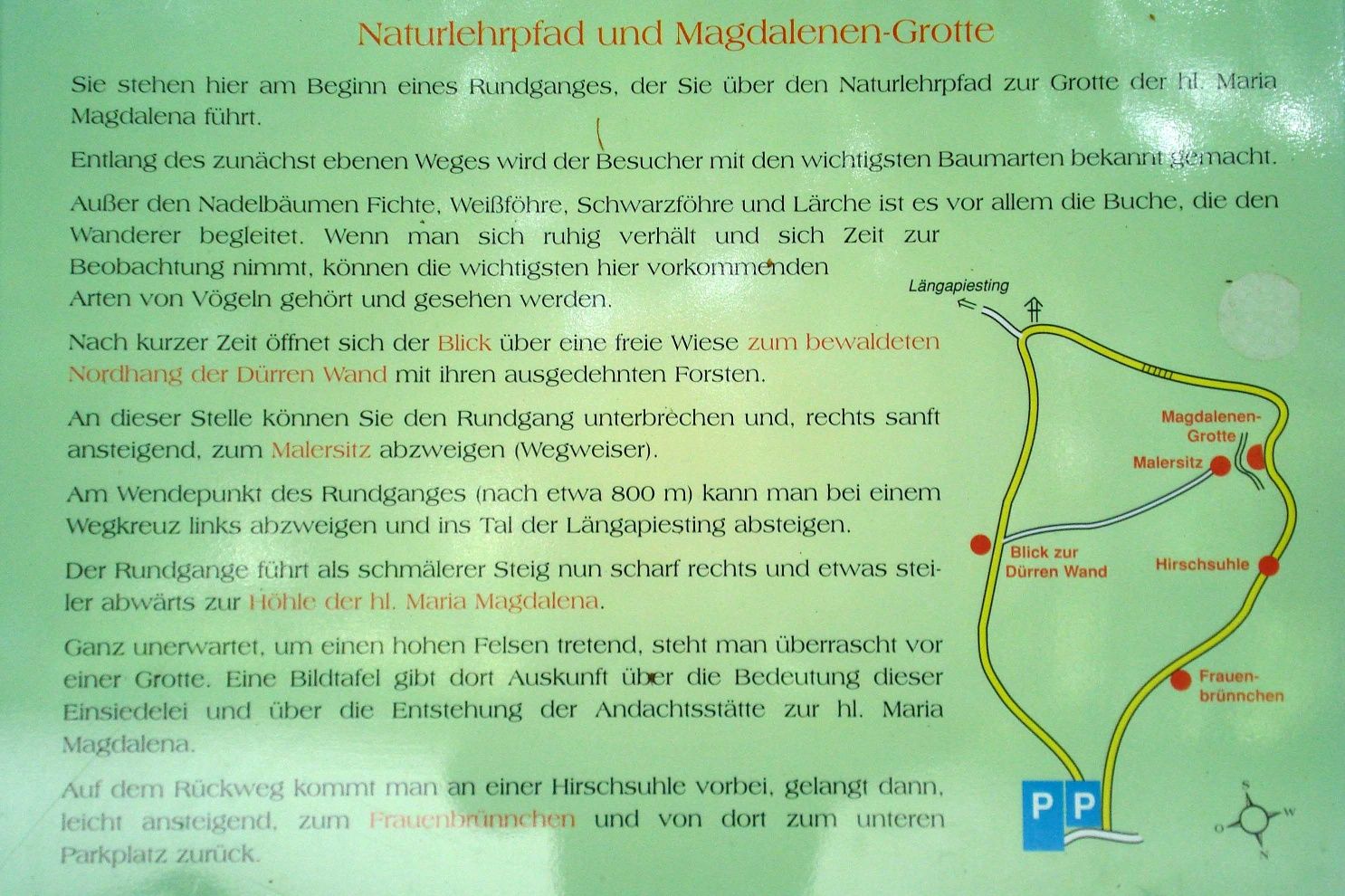 Vydáme se z parkoviště u farního kostela po cestě vedoucí podél plotu zámeckého parku Hoyos do otevírající se krajiny Längapiesting. U rozcestníku na Mariahilfberg odbočuje ze silnice cesta Schaftersbachweg, která nás vede mírně do kopce přes louky a pak kolem idylického domku po lesních cestách k odbočce k jeskyni Magdalenengrotte. Případně můžeme projít kolem malebné kapličky u cesty přes přírodní louku k naučné stezce. Cesta k Magdalenrotte vede borovým lesem kolem jelení dutiny a studánky Frauenbrünnchen na parkoviště na Mariahilfbergu.