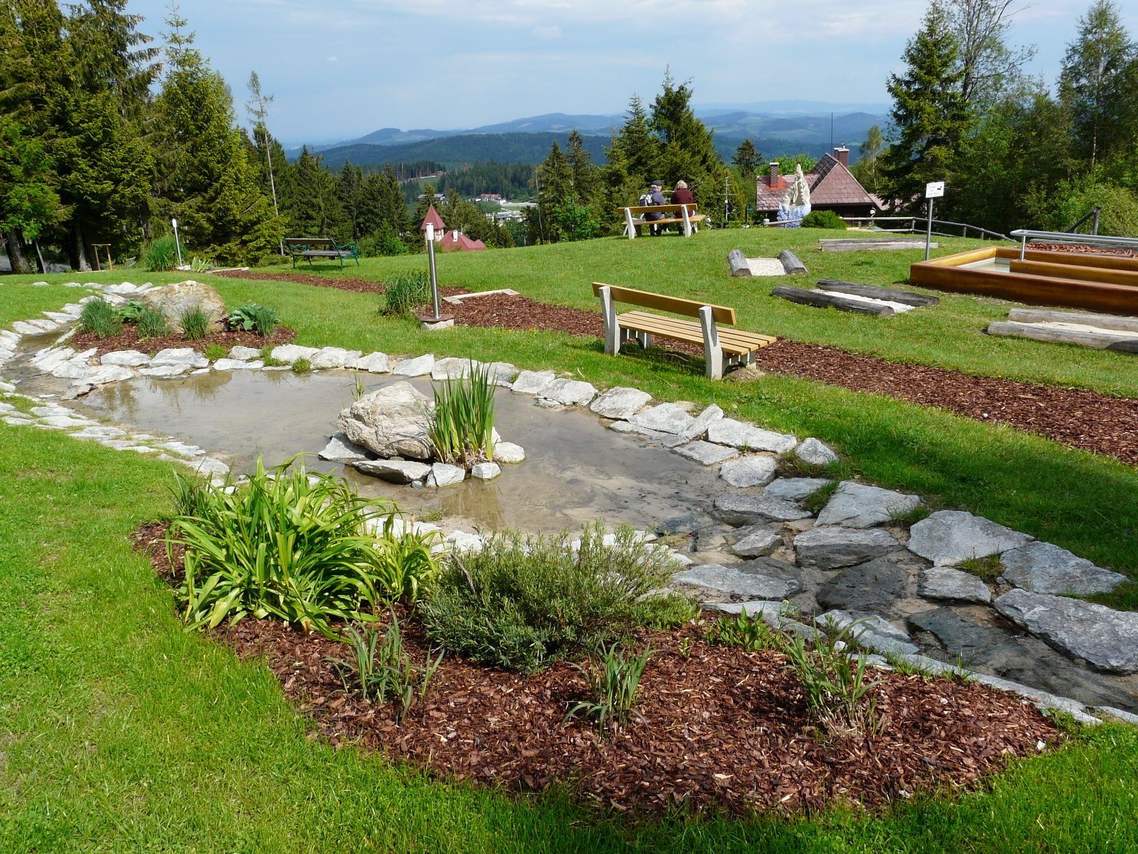 Na tematické vodní stezce můžete prozkoumat otázky o koloběhu vody od deště přes pramen až po potok a rybník.