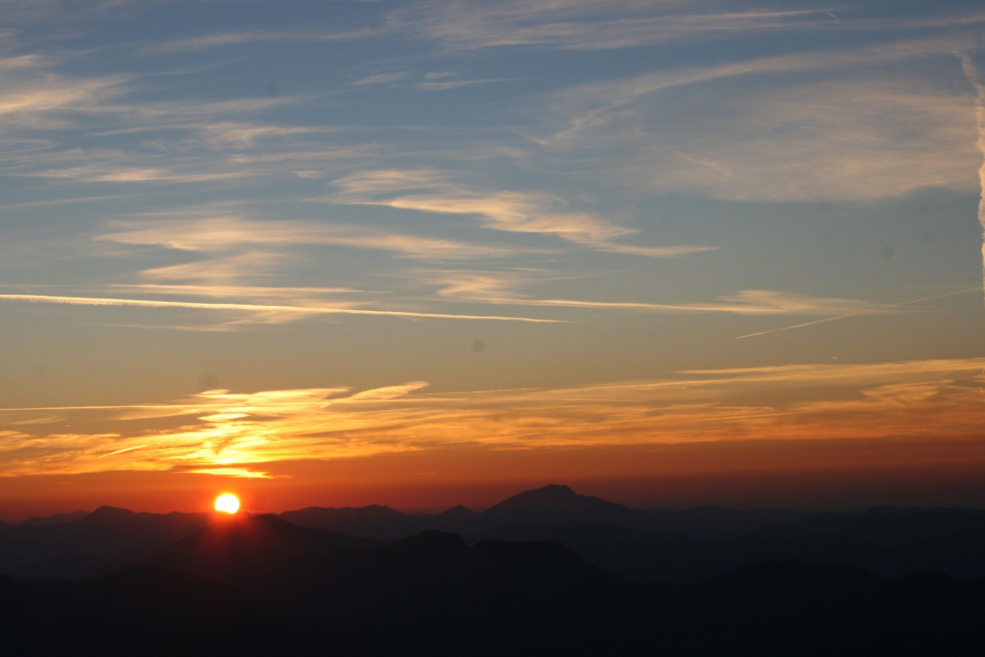 * Východ slunce na terase chaty Fischerhütte, snídaně