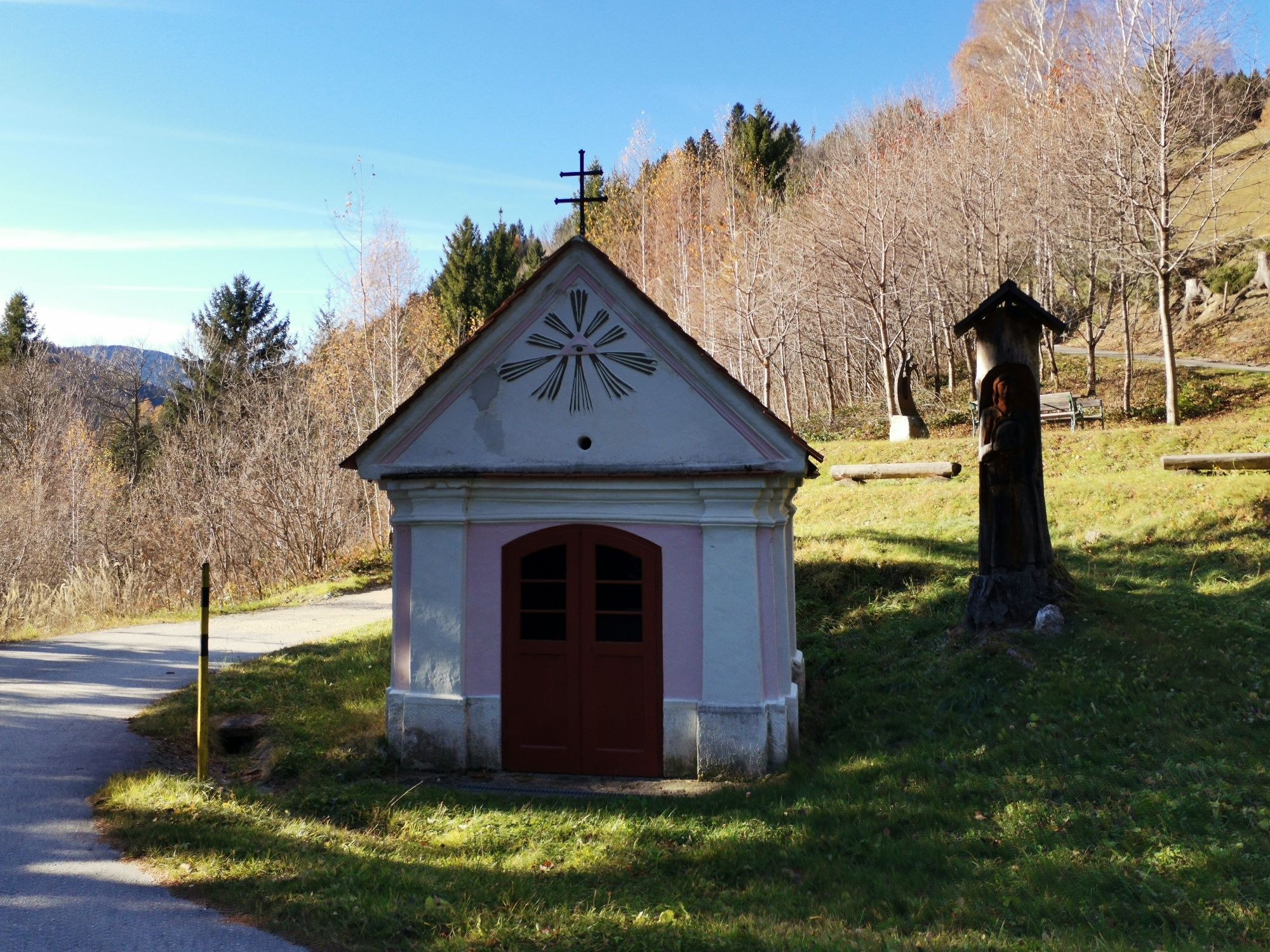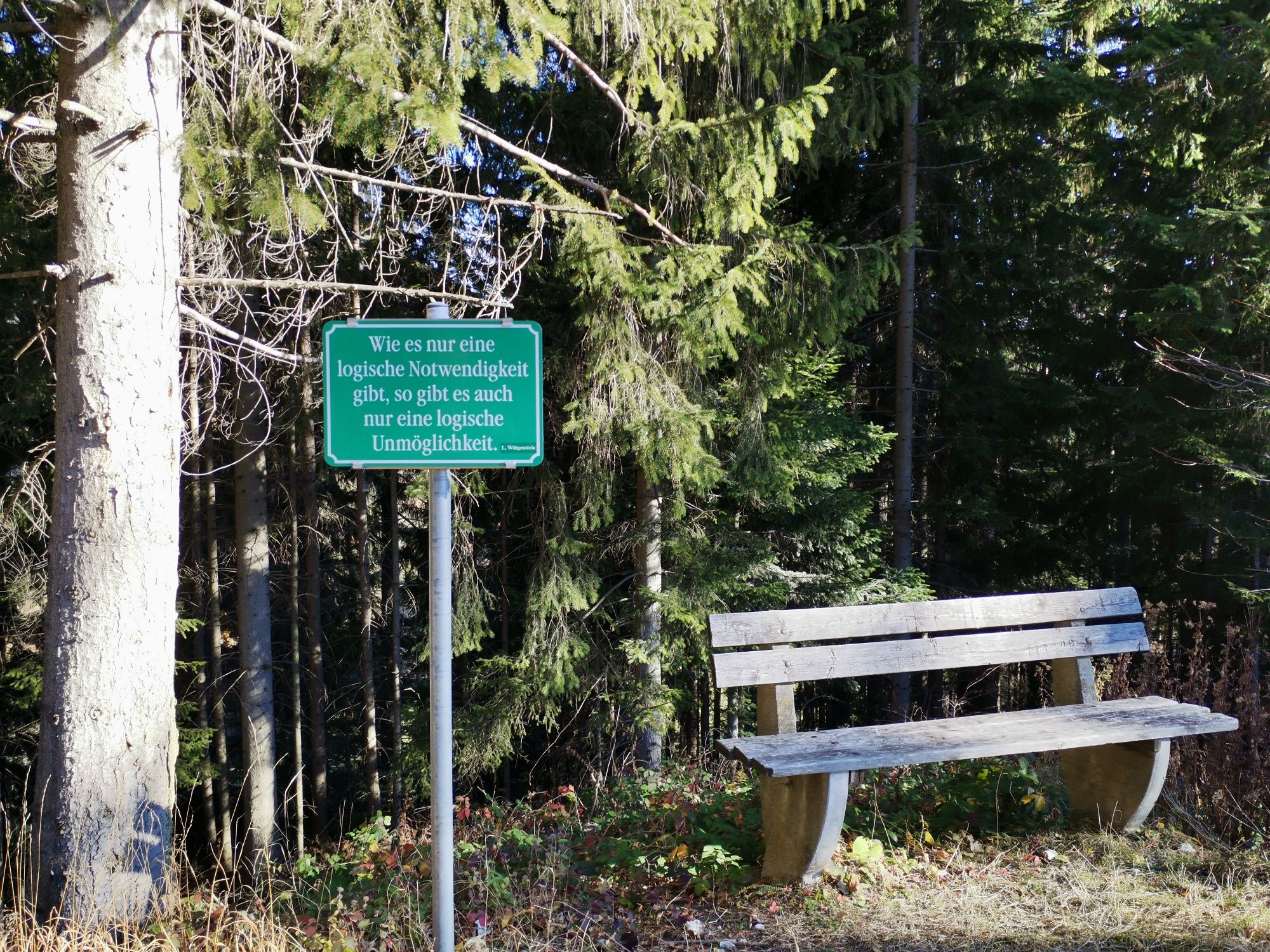 Wittgensteinova cesta začíná mezi Dretenpacherhofem a obecním úřadem a zde vás přivítá první zelená tabule s filozofovými slovy. Stezka pokračuje mírně do kopce po asfaltové cestě s krásnými výhledy. Držte se vpravo a pokračujte do kopce po lesní cestě až k dalším ukazatelům. Po modrém značení dojdete k nejvyššímu bodu túry, Markuskapellu (Trahtkapelle) ve výšce 835 metrů. Odpočívadlo za kaplí má klidné místo a krásný výhled na hory. Poté se držte vpravo a pokračujte po lesní cestě z kopce dolů a opět vpravo na louku, která vede malou brankou na mýtnou cestu. Odbočte vlevo po štěrkové cestě kolem Webermaterlu na polní cestu. Cesta pak vede vpravo podél silnice, vlevo kolem tovární budovy a rovně ke kapli Schneeweißkapelle. S výhledem na obec a za doprovodu šumění potoka dojdete k poslednímu citátu na cestě k výchozímu bodu - "Pro každé dítě je škola místem, kde začíná svět!