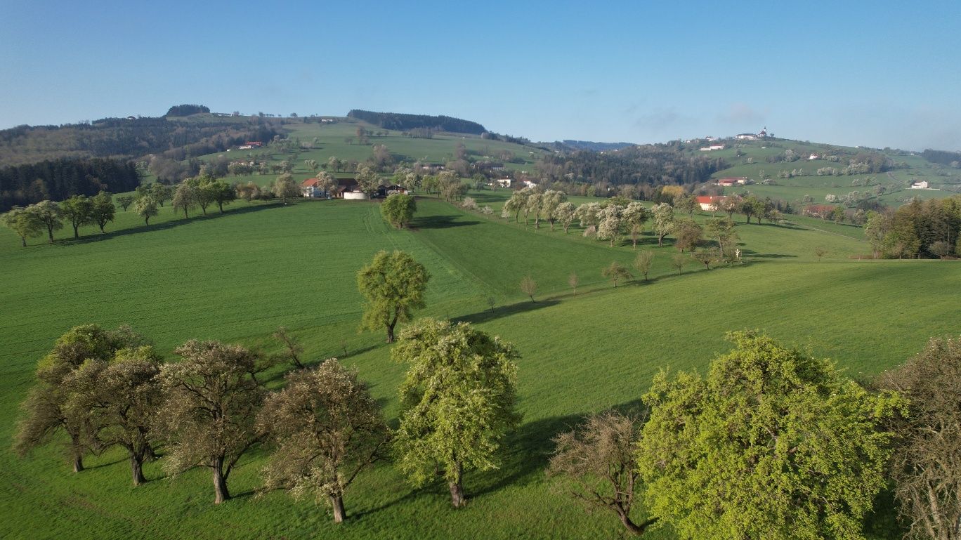 Pěší turistika po loukách, lesích a klidných cestách s výhledy na oblast Mostviertel.