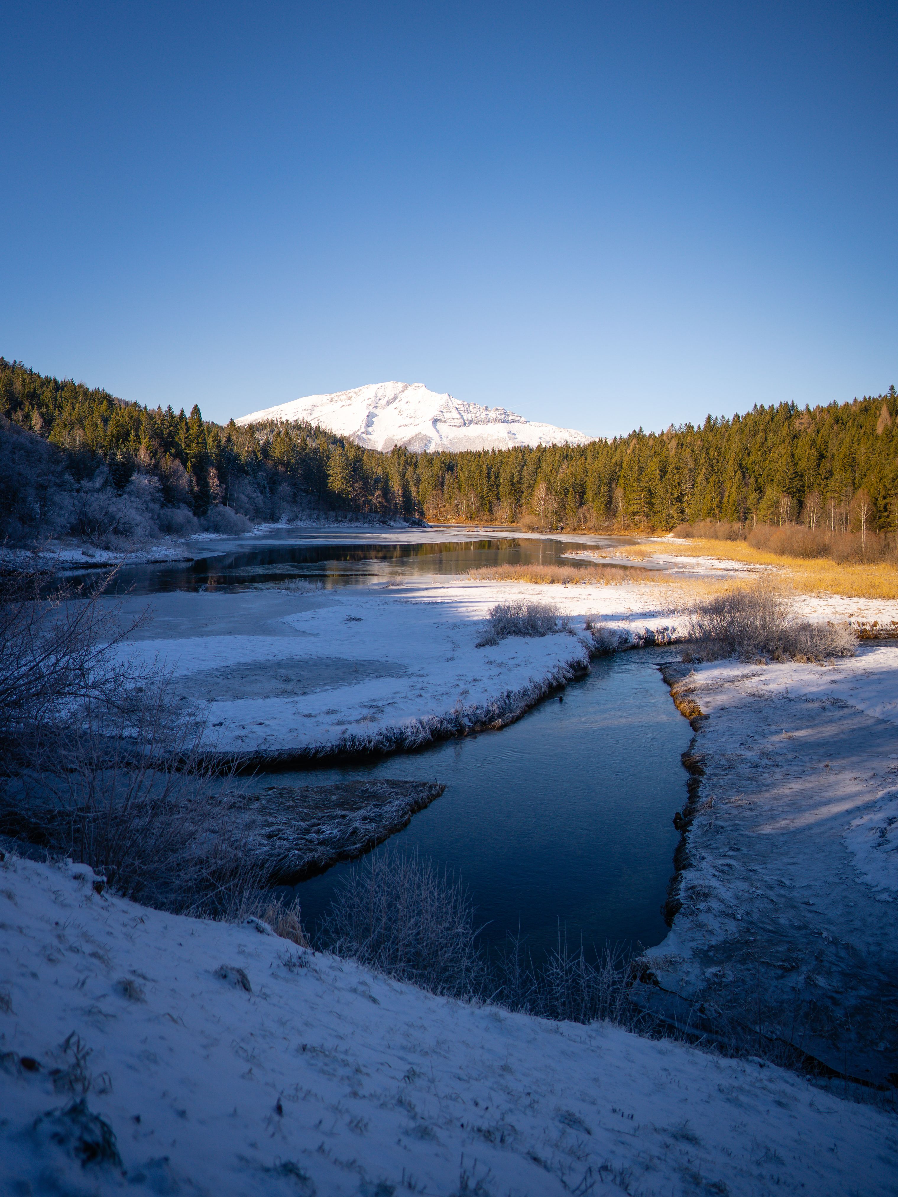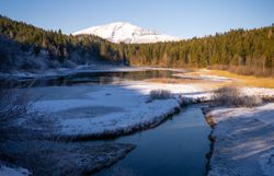 Jezero Erlaufsee v Mostviertelu, zasazené mezi lesy a zasněžené horské vrcholy, nabízí také v zimě nádhernou kulisu pro klidné chvíle v přírodě.