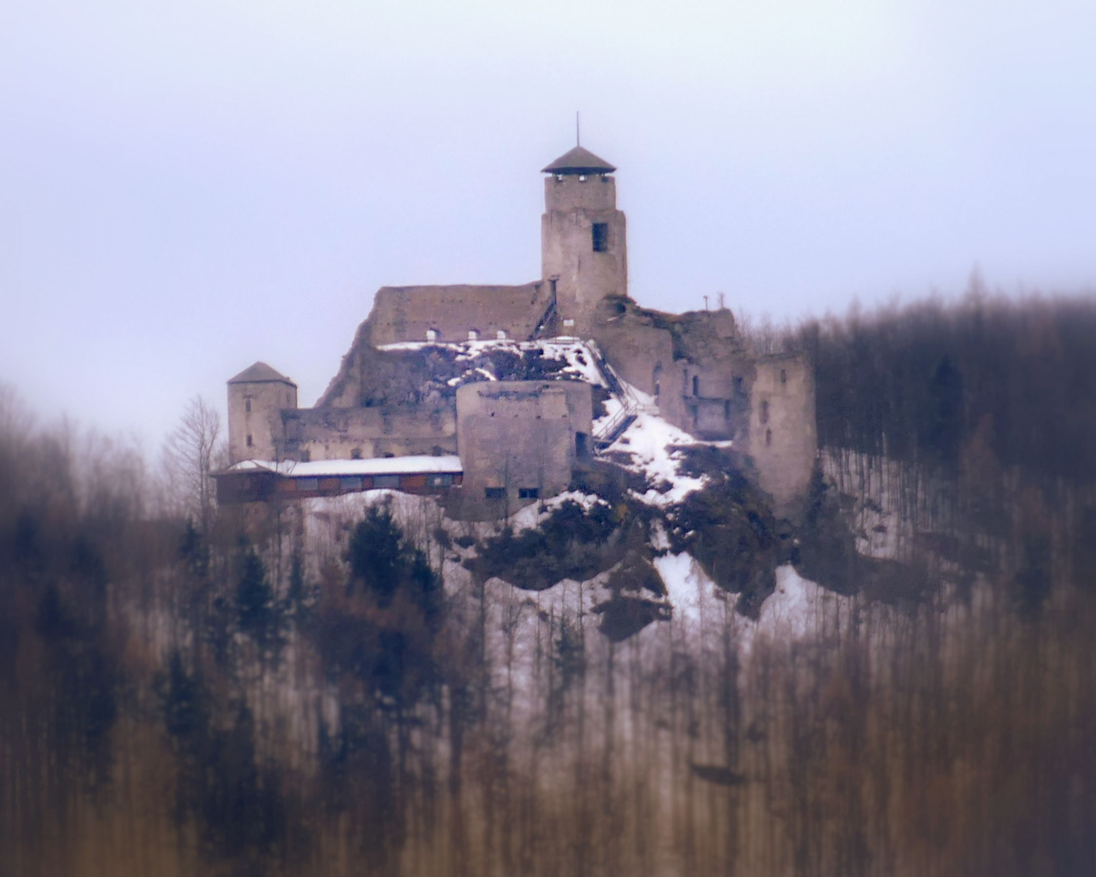 V zimním Vídeňském lese působí zřícenina hradu Araburg, založeného roku 1180, jako tichý strážce okolních kopců.