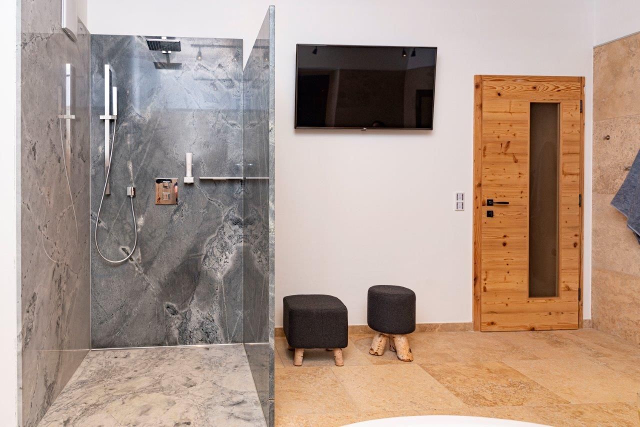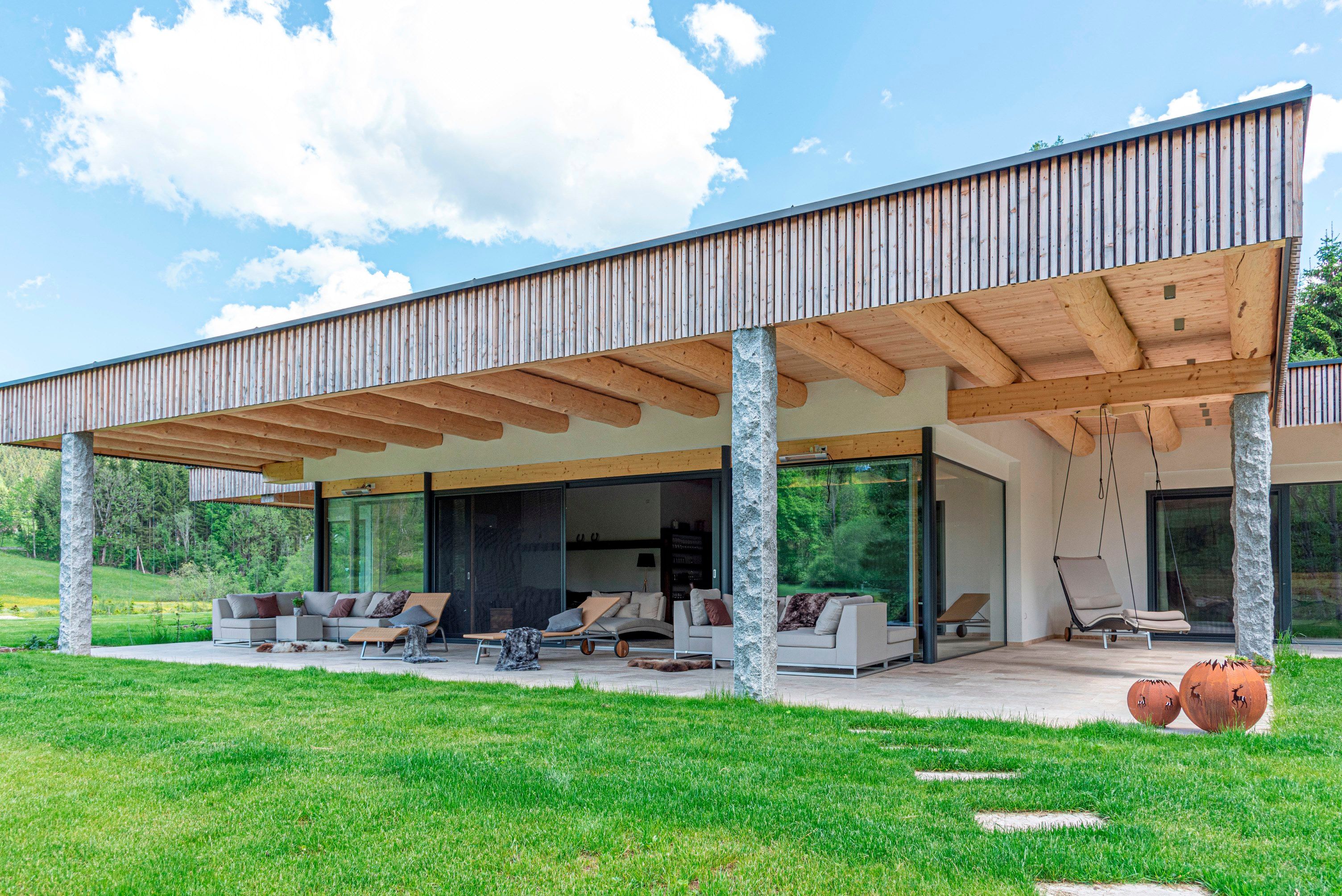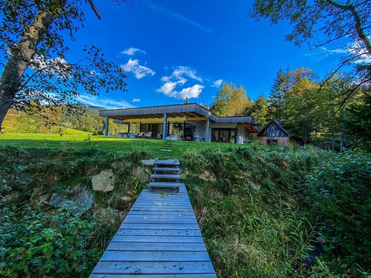 Už pohled zvenčí na fasádu z přírodního kamene s panoramatickými okny od podlahy až ke stropu nebo na stylovou konstrukci ploché střechy z kulatiny dělá z této nemovitosti objekt, který obsahuje "čistou útulnost" - zcela výjimečným způsobem, a zve tak k odpočinku a dobré náladě.