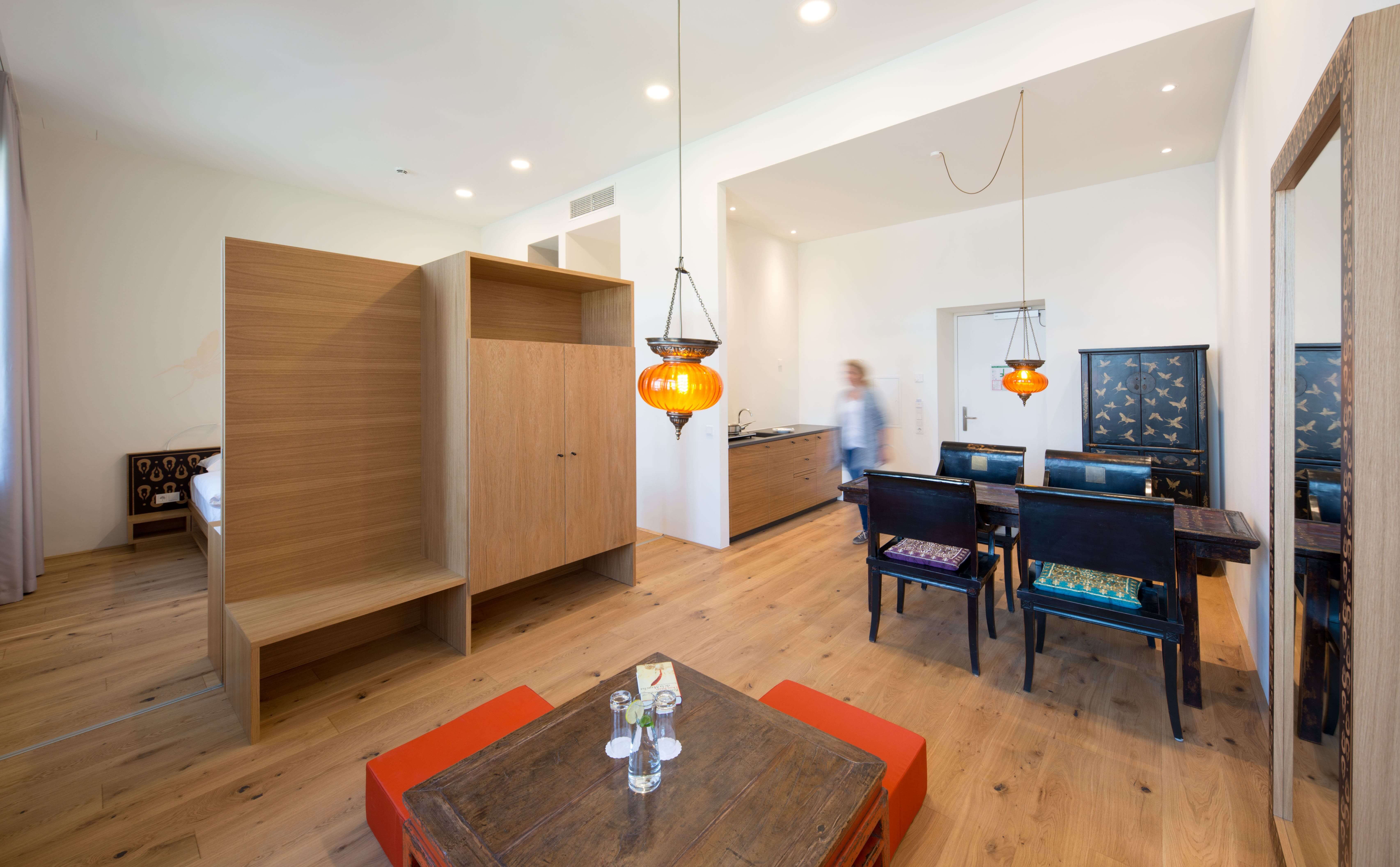 V hotelu GABRIUM je každé patro věnováno jinému kontinentu a vyzvedává typické stylistické prvky příslušného kontinentu. Barevné vzory, s láskou shromážděné artefakty a speciální upcyklovaný nábytek: každý z našich pokojů je pozvánkou k inspirativním myšlenkovým cestám do nových a neznámých světů.