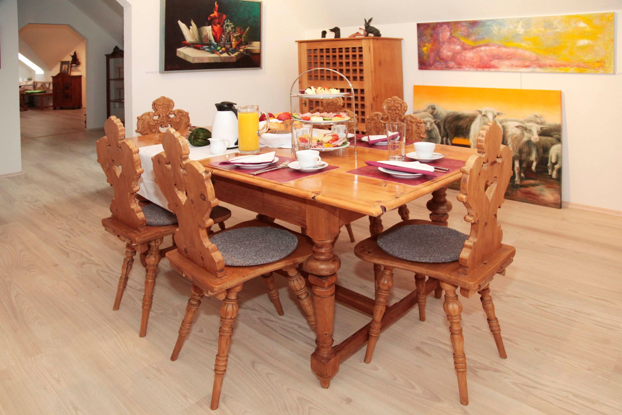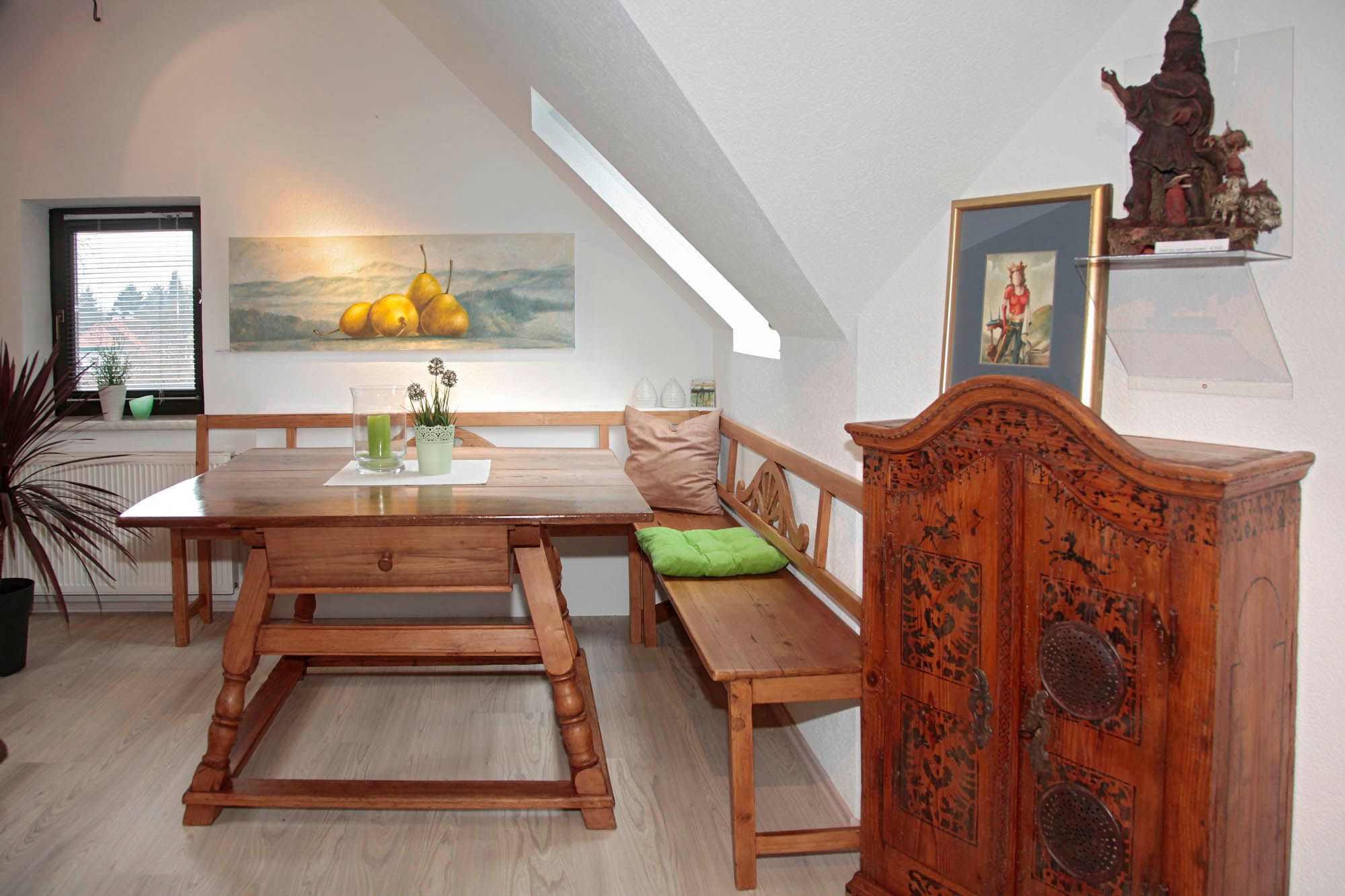 Stylový nábytek z regionu v umělecké kombinaci s obrazy a sochami majitele a umělce Herberta Petermandla vytváří atmosféru bytu o rozloze 85 m2.
