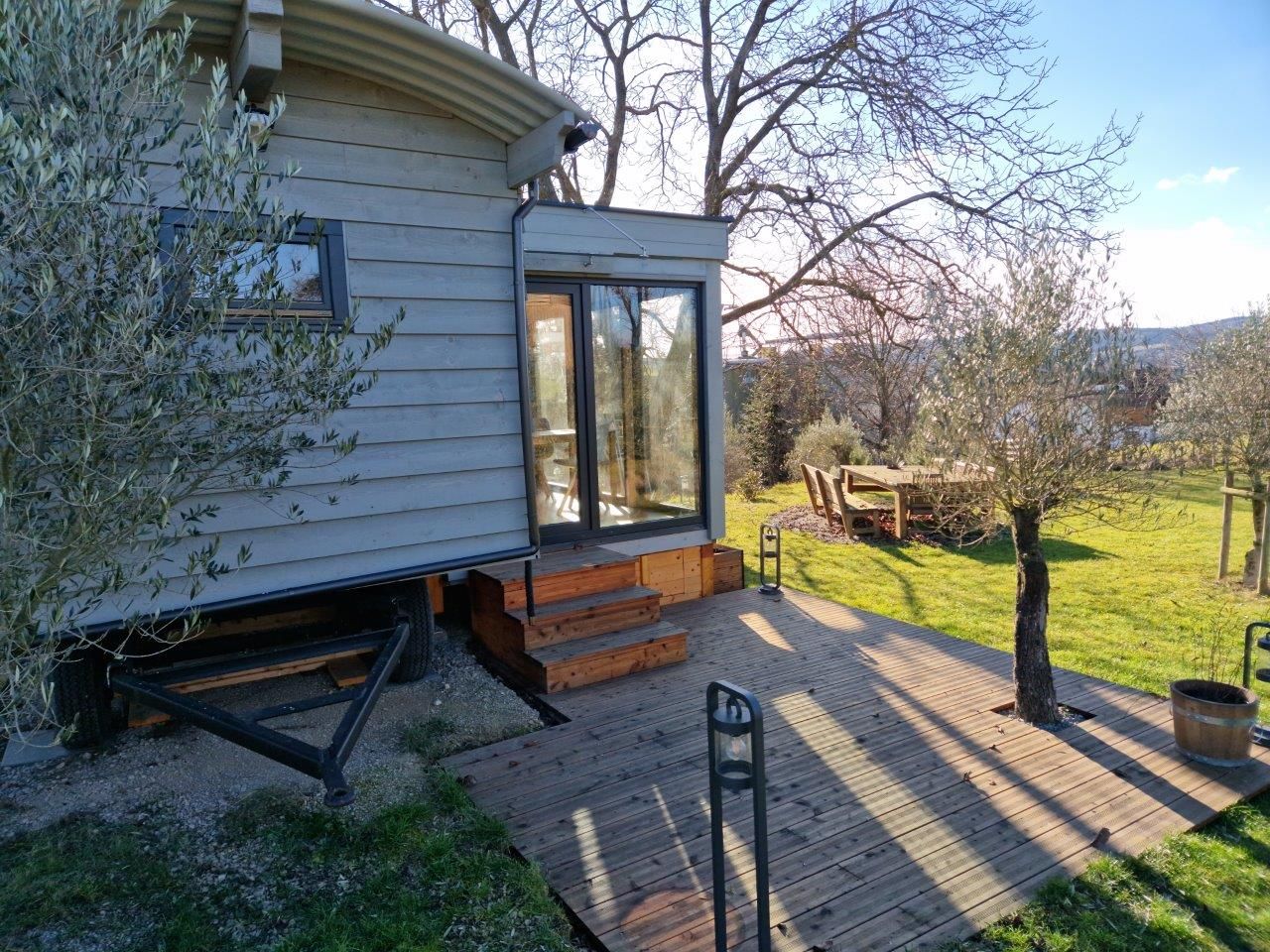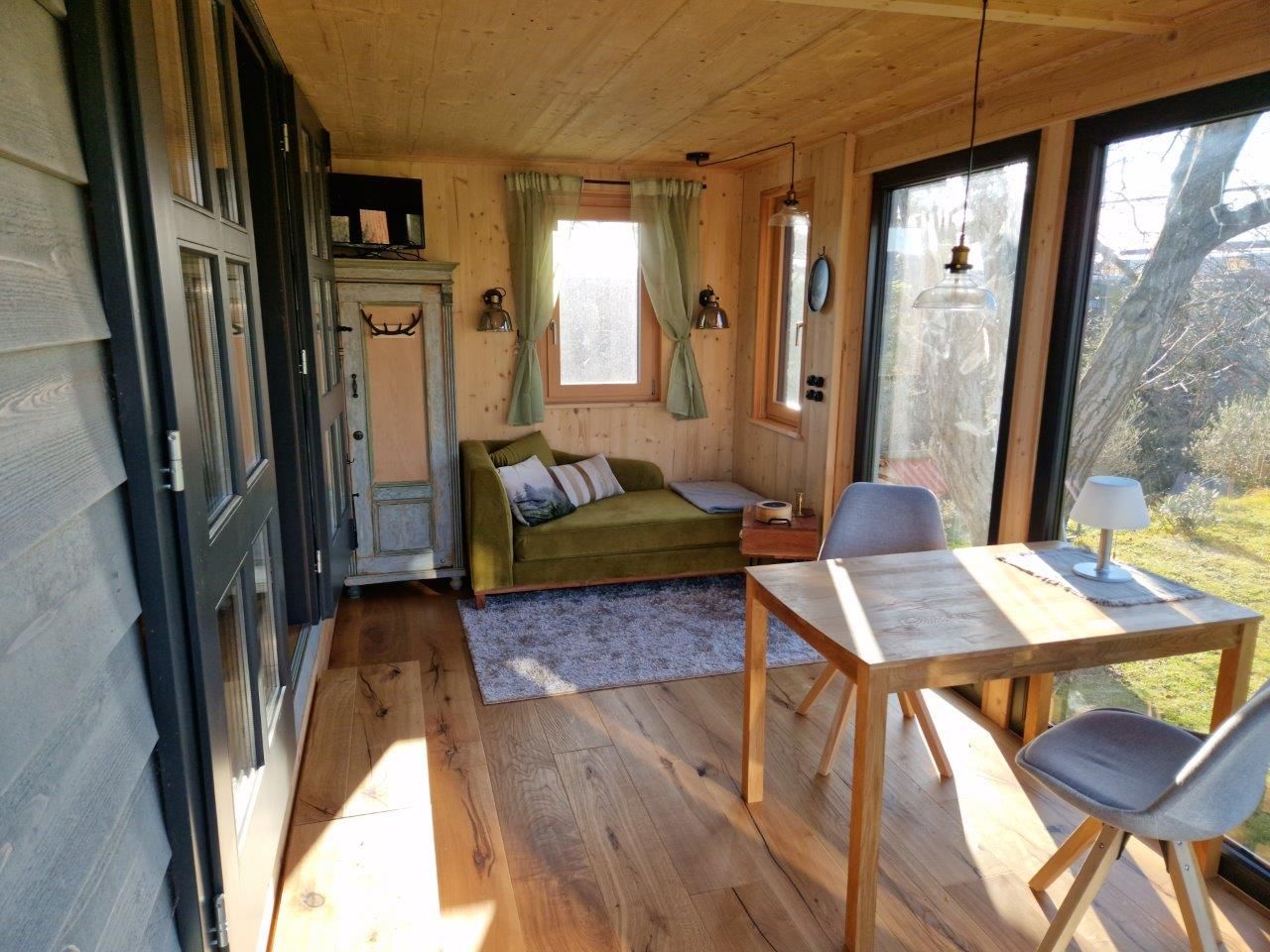 Tiny House "Luise" - upravený cirkusový vůz - nabízí moderní, přírodě blízké bydlení na velké louce s nádherným panoramatickým výhledem a vlastním fotovoltaickým systémem, takže si můžete užít dovolenou z velké části energeticky nezávislou.