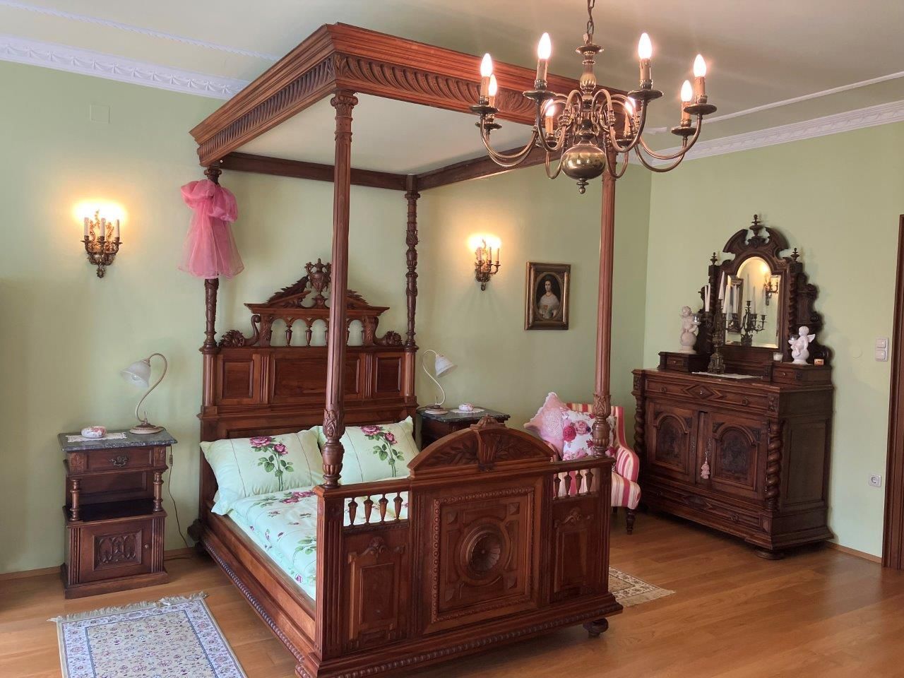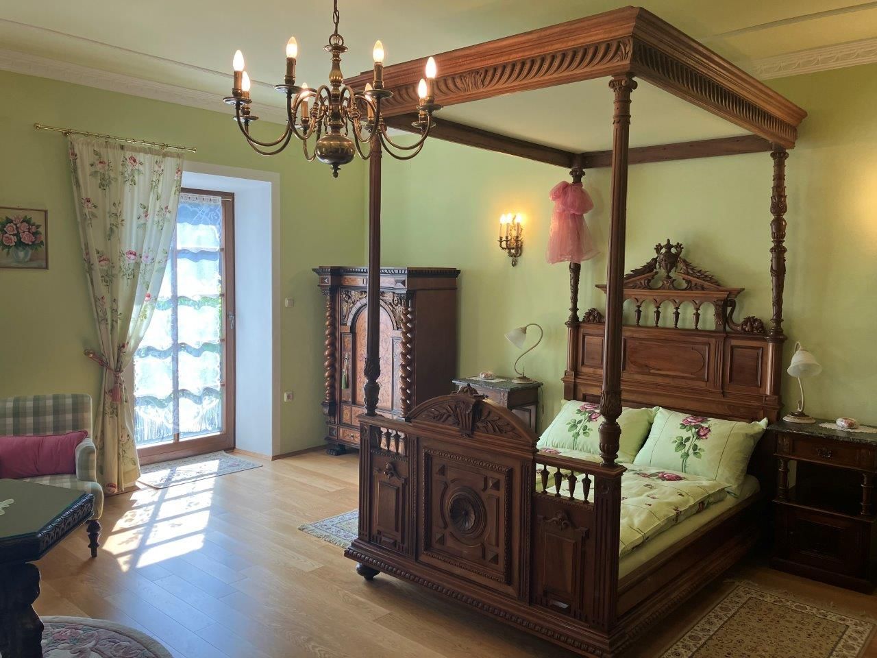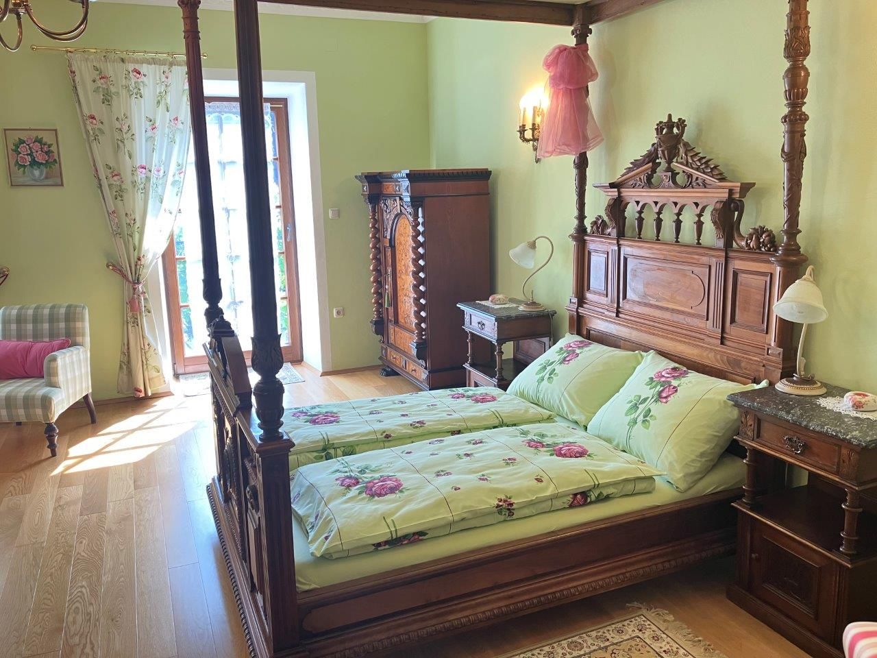 Starý zámek s renesančním arkádovým nádvořím ze 16. století je ideálním výchozím bodem pro pěší a cyklistické výlety údolím Traisental. Genießerzimmer je zařízen stylovými starožitnostmi a starožitnou postelí s nebesy. Součástí bytu je luxusní koupelna a moderní kuchyň. Z balkonu je výhled do zasněné růžové zahrady.