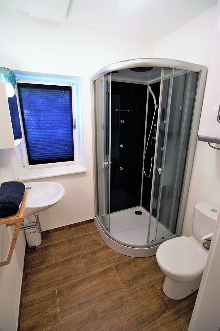 1 koupelna se sprchovým koutem, WC, umyvadlo