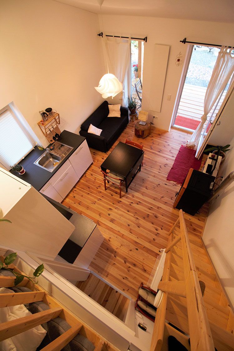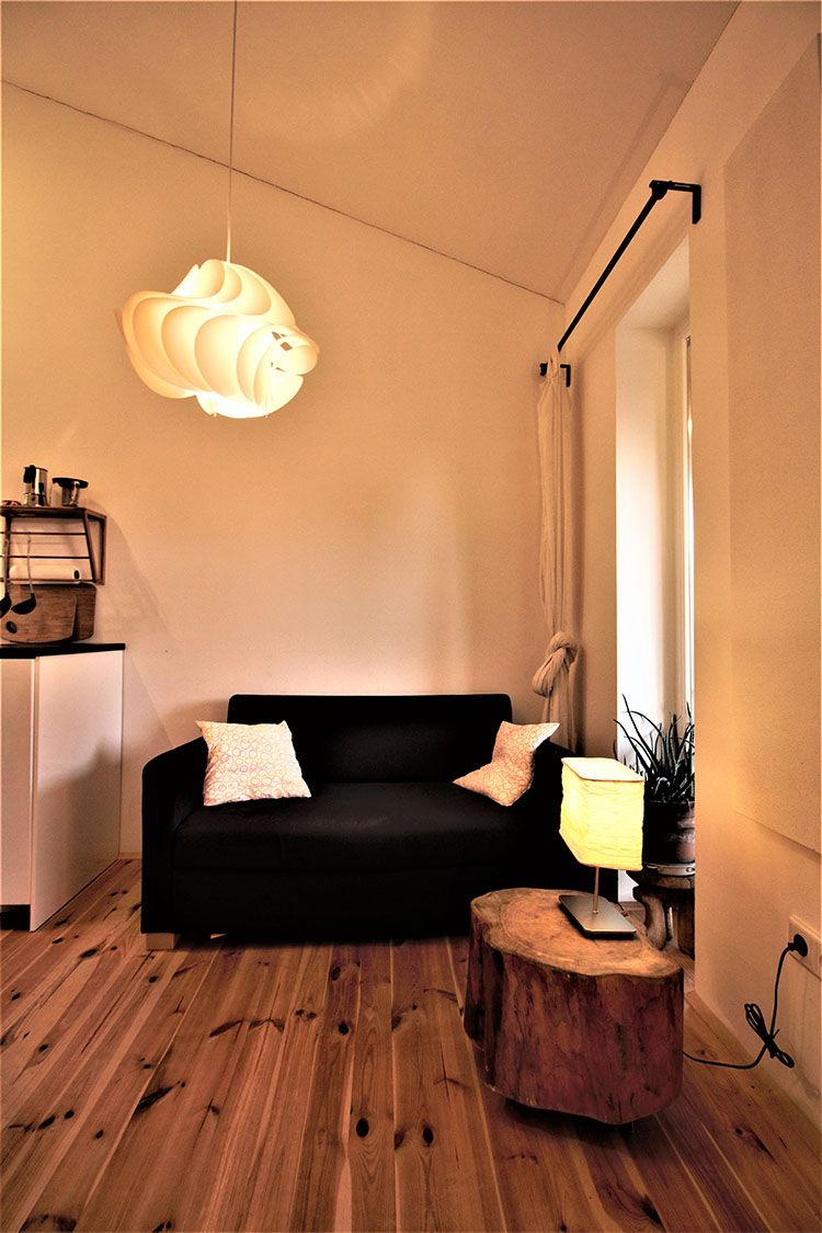 1 velký obývací pokoj s kuchyní, pohovkou, TV a galerií.
