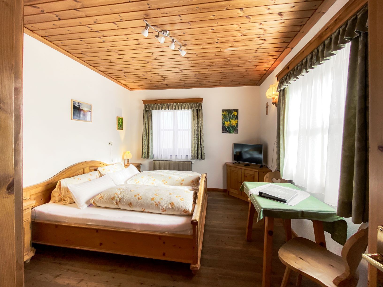 Objednat si tu můžete snídani, polopenzi o třech chodech, na požádání také vegetariánskou stravu, nebo pochoutky z nabídky občerstvení. V restauraci s kachlovými kamny z roku 1925 (pro cca 30 osob), v salonku Ausnehmerstüberl (pro cca 16 osob) nebo v salonku Risgrabenstüberl (pro cca 14 osob) si můžete pochutnat na domácích specialitách z vlastního hovězího, jehněčího a vepřového masa nebo na domácím chlebu z dřevěné pece, másle, tvarohu apod. Před domem jsou pak další místa lákající k posezení. Rodinné oslavy nebo skupiny výletníků jsou vítány po předchozí domluvě.