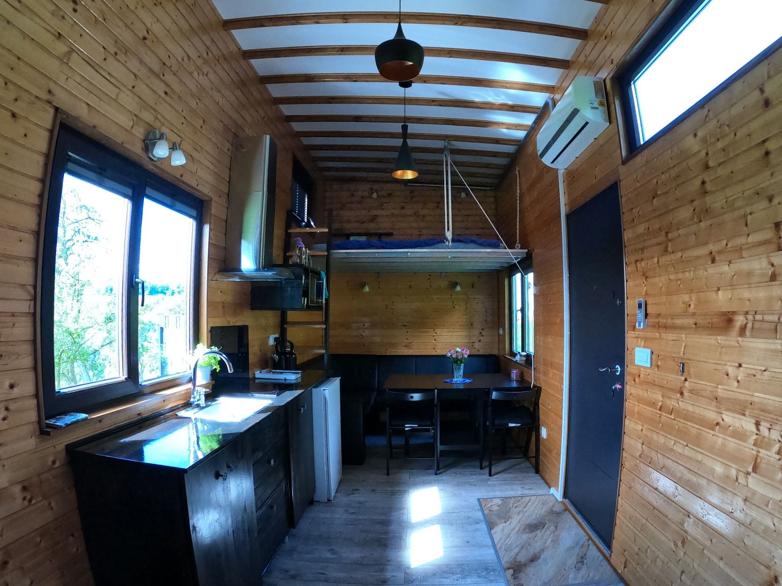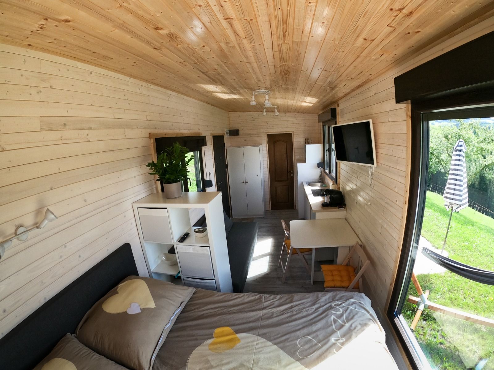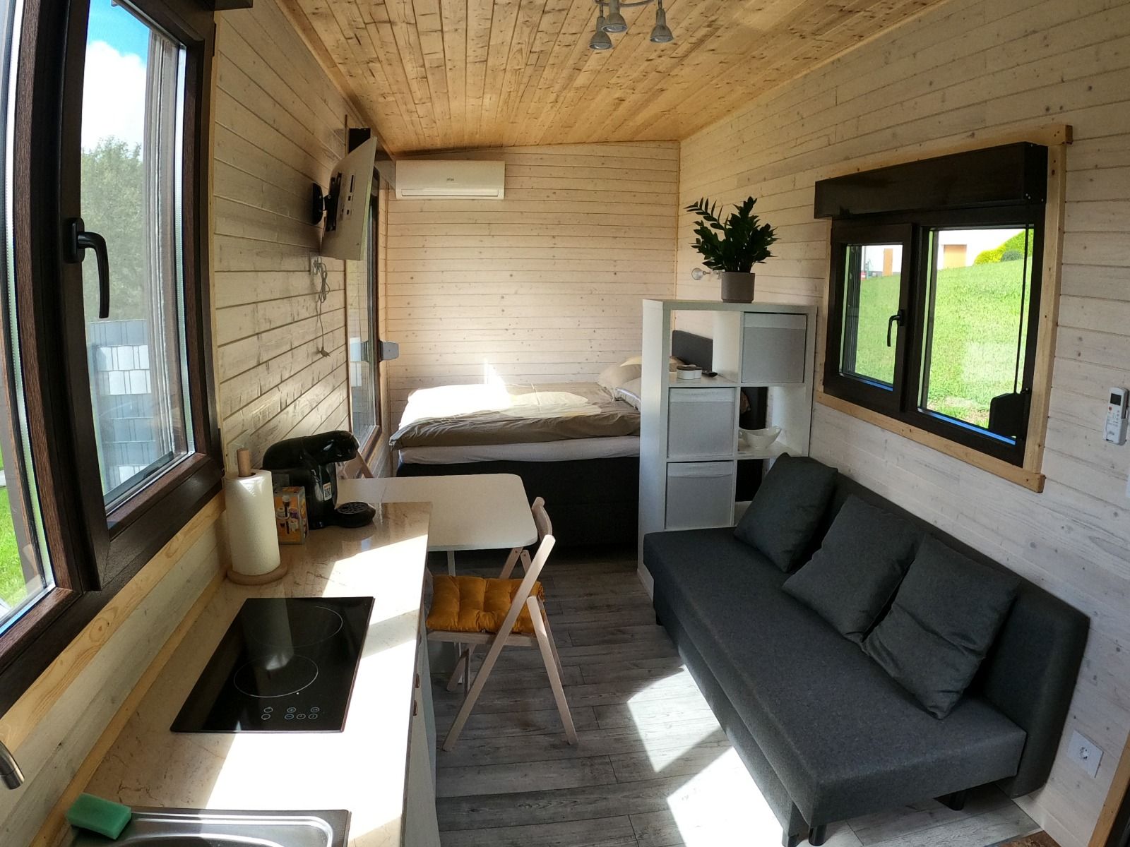 Každý Tiny House je vybaven kuchyňkou, kávovarem, mikrovlnnou troubou, postelí na spaní, posezením a šatní skříní. V koupelně je sprcha s WC, umyvadlo s ručníky a fén.