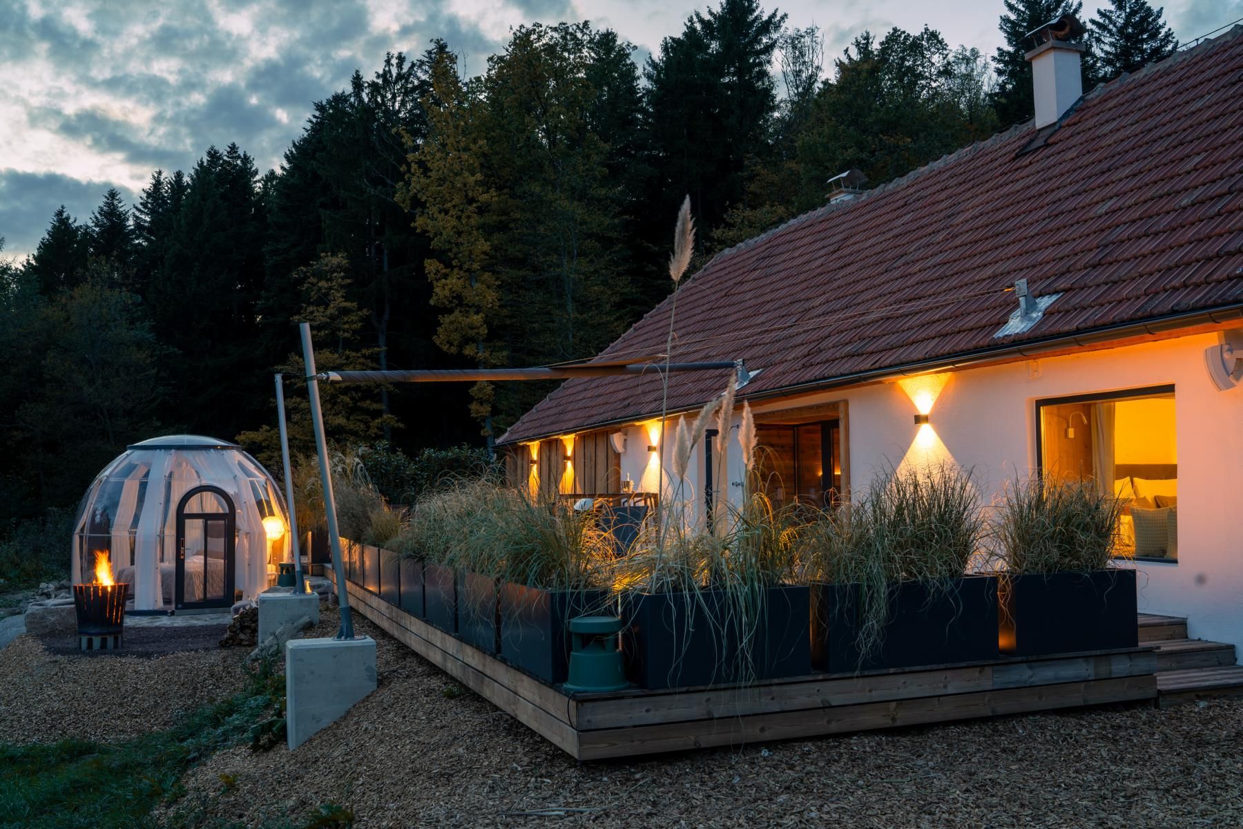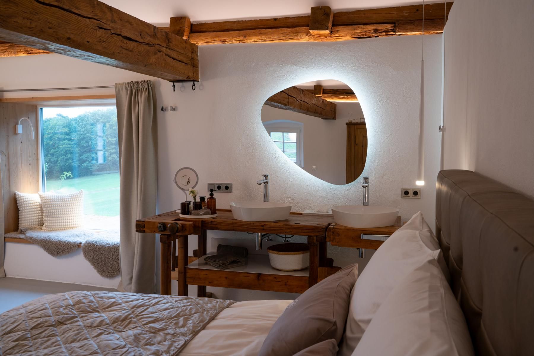 Zažijte ryzí luxus v naší chatě, která se nachází na naprosto odlehlém místě obklopeném pastvinami a lesy. Můžete si zde užívat nerušený klid, obdivovat hvězdnou oblohu a dokonce spát pod třpytícími se hvězdami v "hvězdné posteli", manželské posteli od společnosti CASARISTA. Toto útočiště je ideální pro novomanžele a všechny, kdo hledají jedinečnou a soukromou oázu pohody s vlastní saunou,vířivou vanou (totožnou, pouze se sladkou vodou) a volně stojící vanou.
