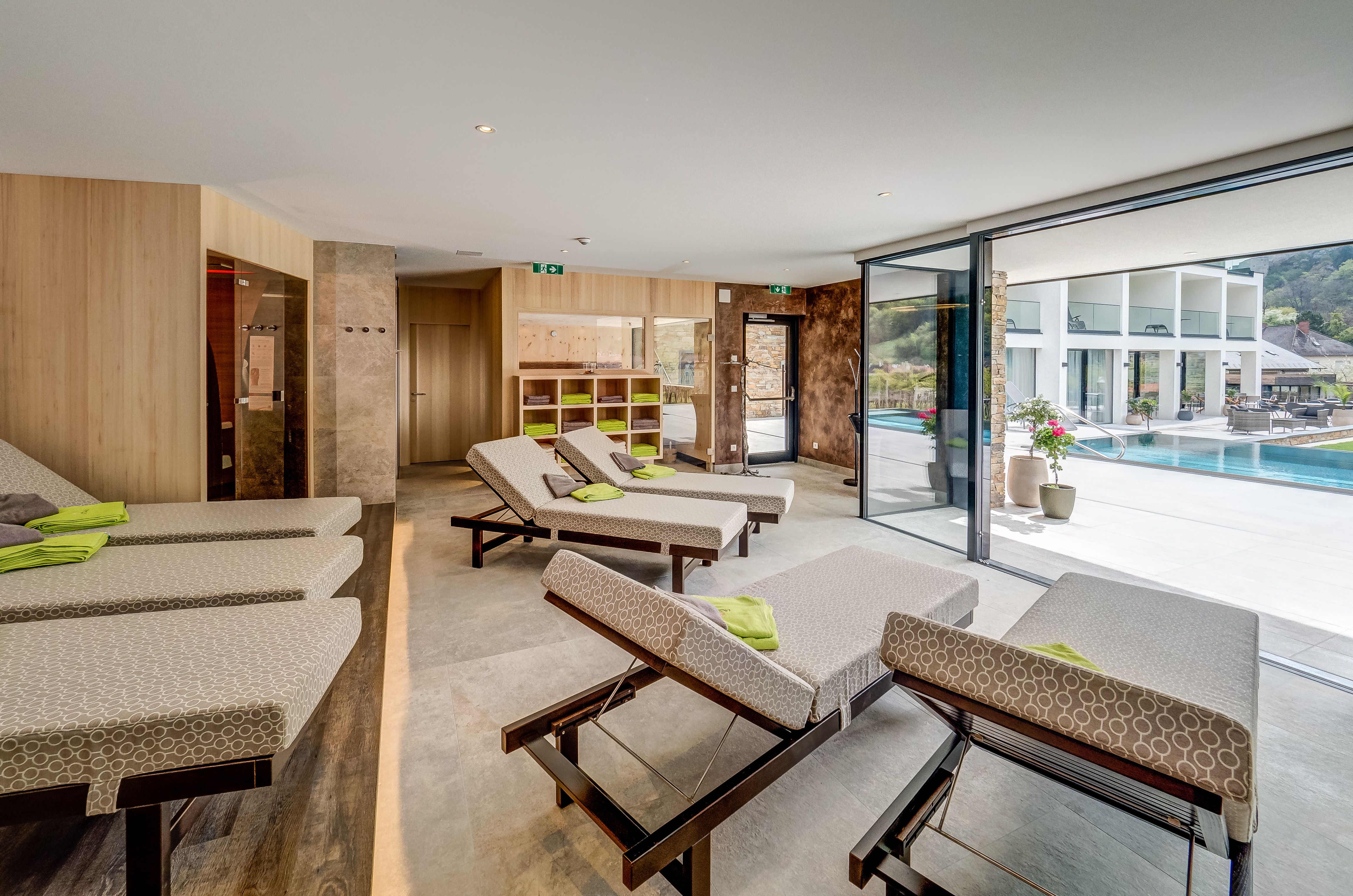 Vyhřívaný nekonečný bazén z nerezové oceli, saunový dům se dvěma různými saunami a idylický salonek zvou k posezení a relaxaci uprostřed nádherné kulisy vinic Wachau.