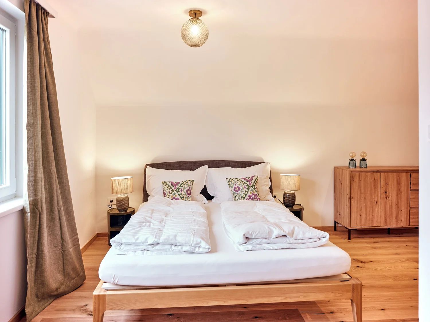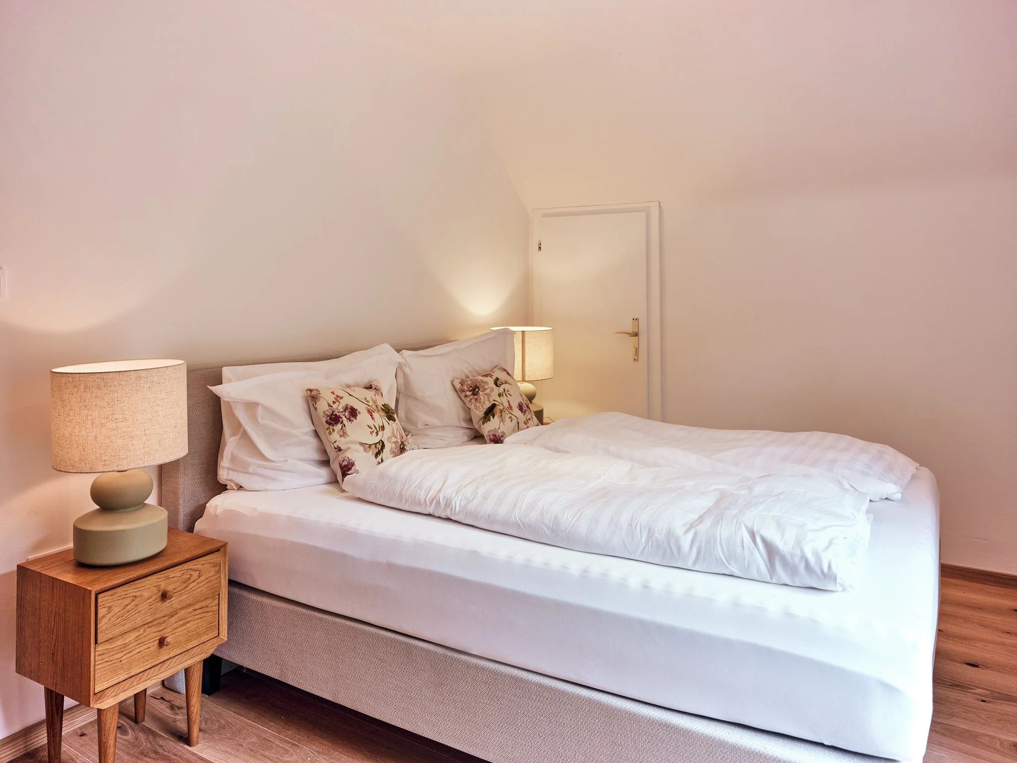 - Dvoulůžkový pokoj s nábytkem z masivního dřeva a dřevěnou podlahou, sprchou/WC, TV a klimatizací.