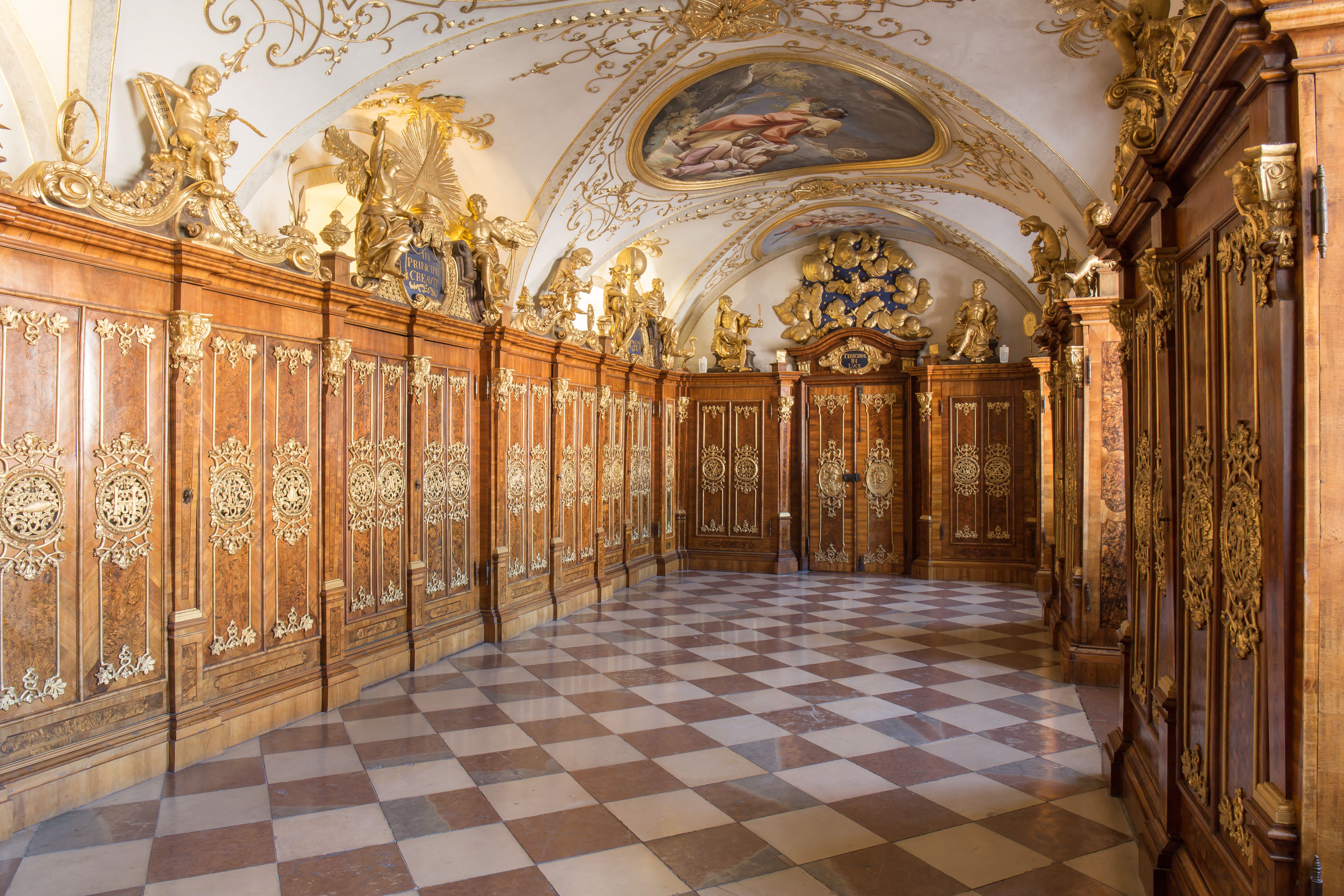 - Fresky a malby: nástěnné a stropní malby jsou převážně dílem Thomase Friedricha Gedona a Daniela Grana, některé však byly později nahrazeny díly Bartolomea Altomonteho.