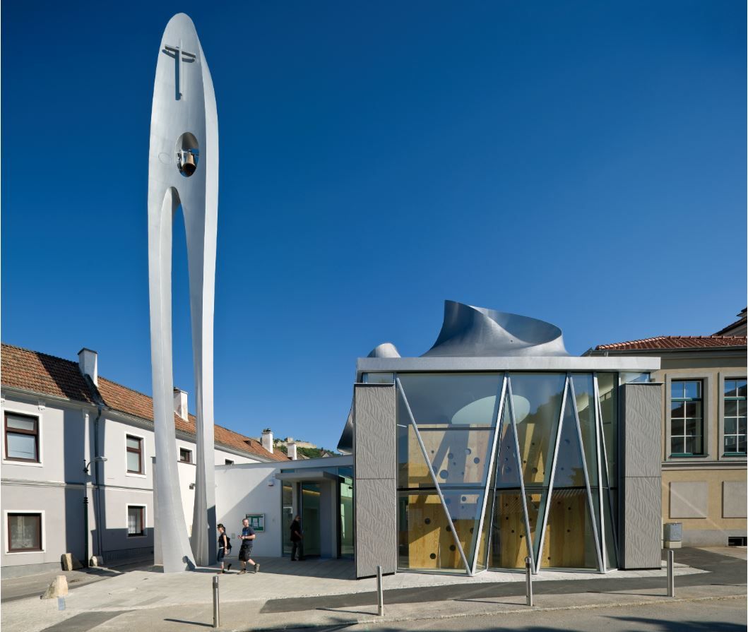 Vnější plášť střechy tvoří 8 mm silné, trojrozměrně tvarované ocelové desky přivařené na rámovou konstrukci. Střešní prvky byly navrženy a vyrobeny pomocí technologie stavby lodí. Důležitým architektonickým vzorem byl Le Corbusier, a to díky svým odkazům na stavbu lodí, ale také díky svému klášteru v La Tourette. Ten také symbolizuje Boží Trojici.