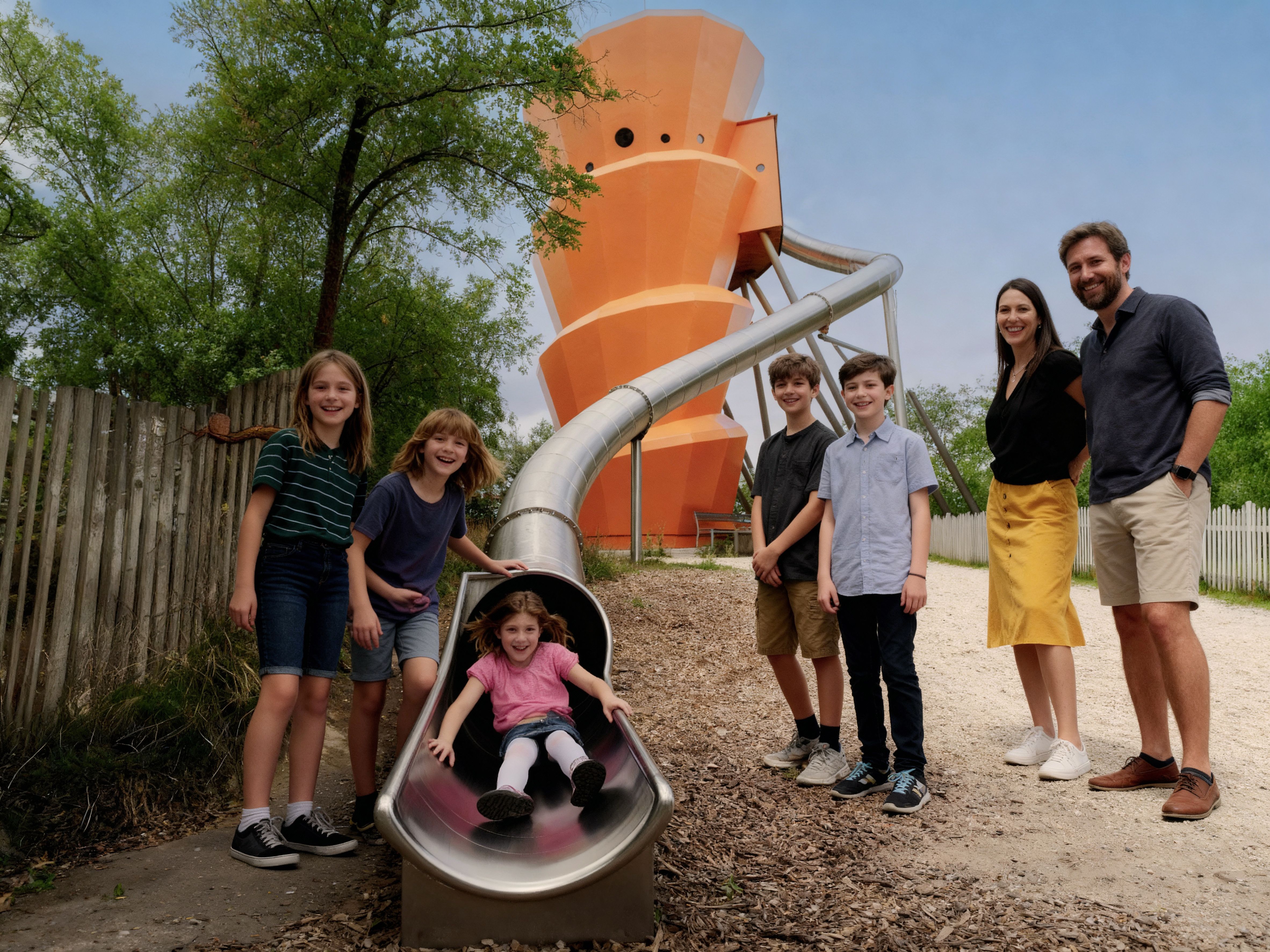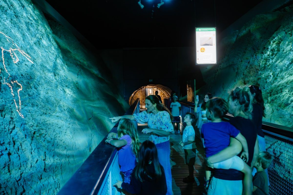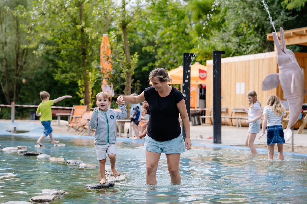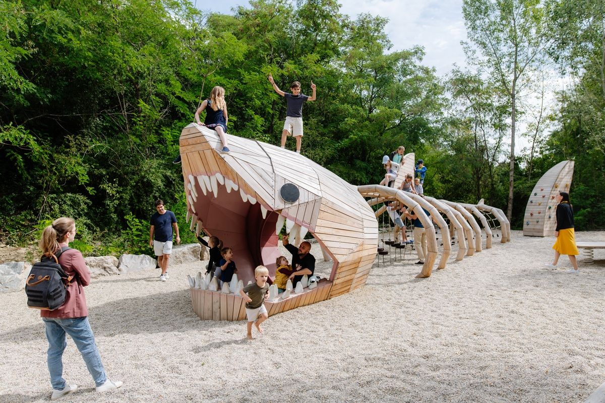 Ve venkovní části areálu se mohou děti vyřádit na kuličkové dráze, dřevěném modelu pravěkého žraloka, různých skluzavkách, na písčité pláži s fosilními žraločími zuby, sladkovodními perlami a mušlemi či v herní zóně s vodními atrakcemi a lanovou prolézačkou s obří houpačkou. Do výšky vás pak zavede rozhledna ve tvaru ulity mořského plže.