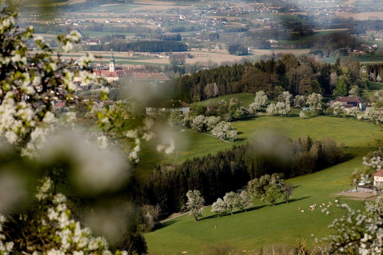 Mezi kvetoucími hruškami je vidět opatství Seitenstetten.