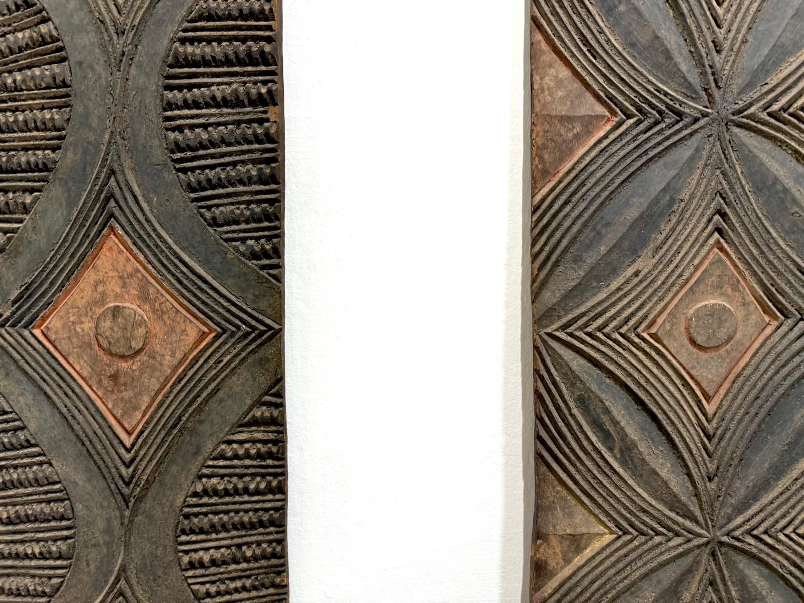 Pohled do interiéru umělecké galerie s dřevěnou podlahou, obrazy na stěnách a dřevěným stolem uprostřed.