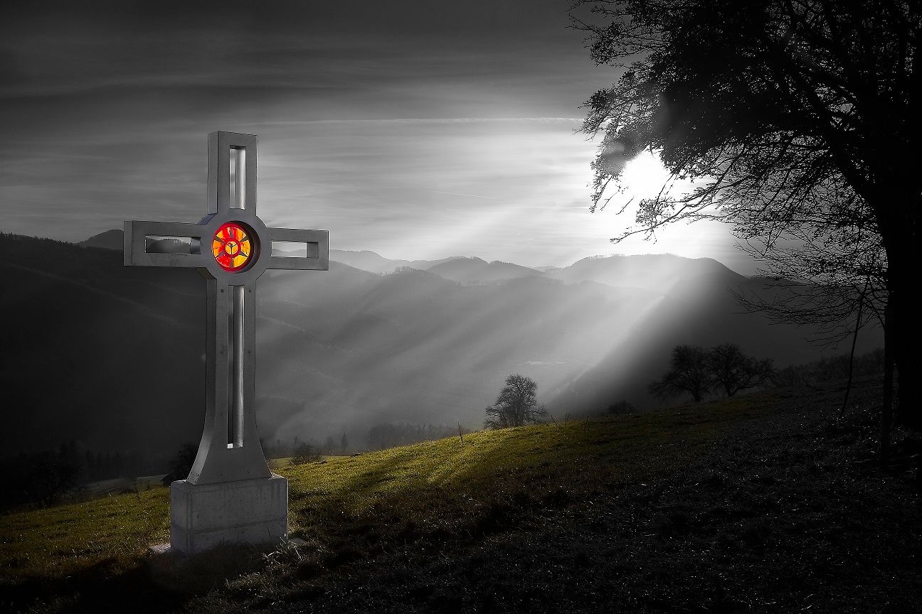 Kříž na kopci (vztyčený v roce 2011 skupinou pro výzkum místní historie Hofstetten-Grünau) září svou nádherou daleko do údolí.