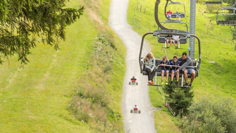 Děti i dospělí si mohou vybrat mezi koloběžkami a horskými kárami, což je směs motokár a sáněk. Malí sjezdaři jezdí pohodlně na sedadlech svých rodičů - nebo se souhlasem rodičů sviští dolů sami z výšky 135 centimetrů. Obzvlášť pěkné: Na oceněné horské dráze přes louky a lesy je jako bezplatný příplatek zahrnuto i léčivé ovzduší oblasti Wechsel.