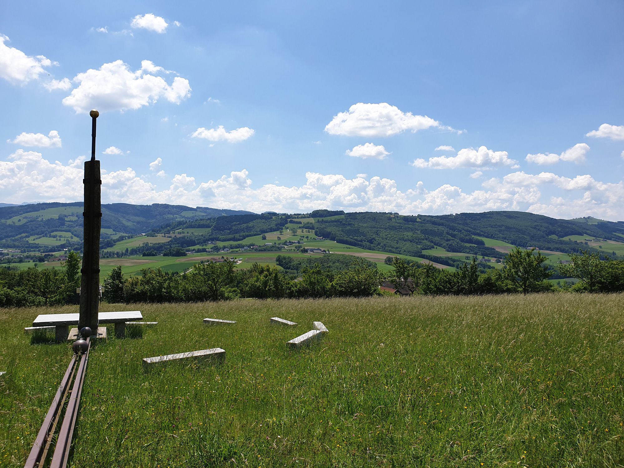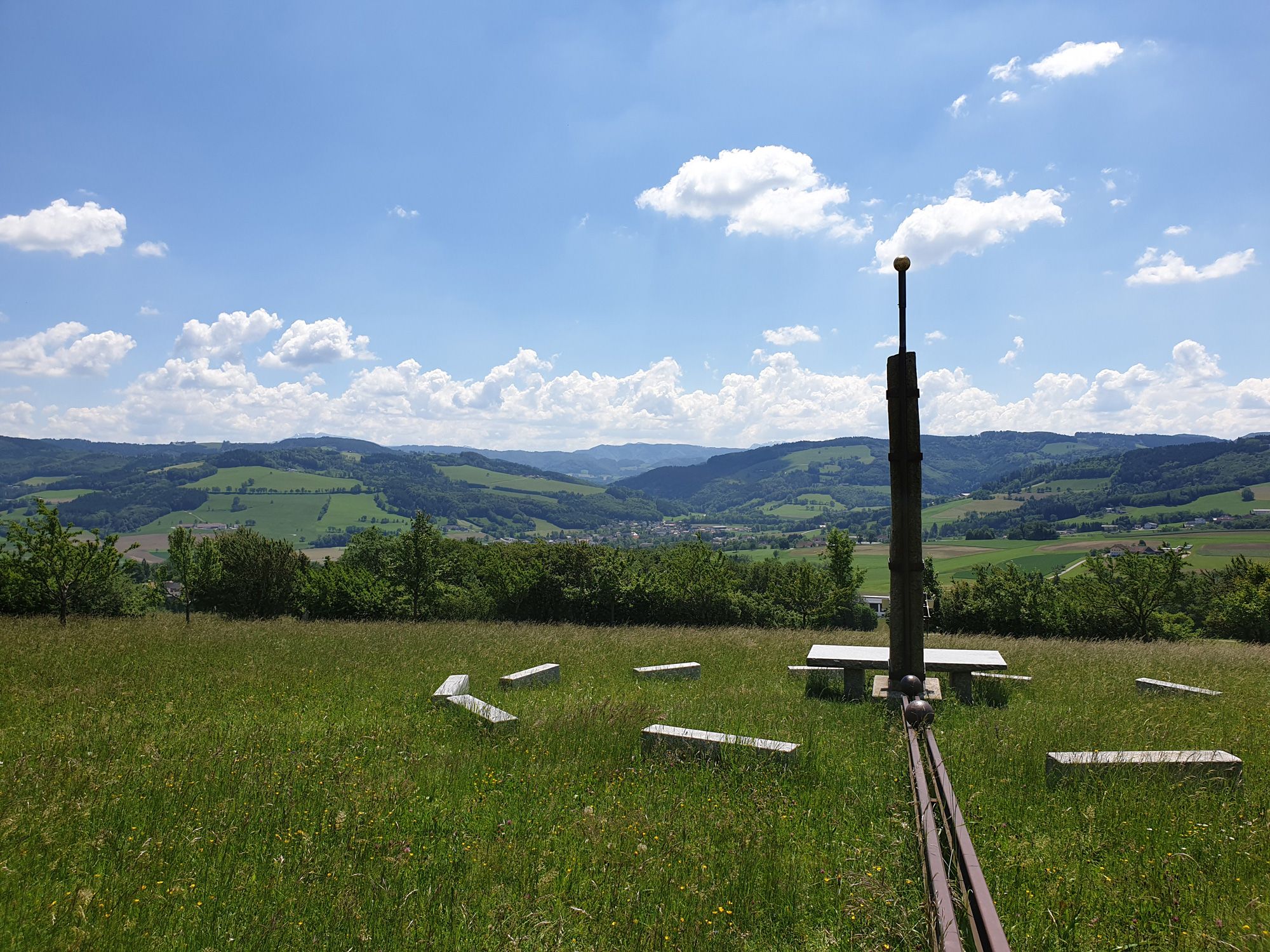 Kolejnice z bývalé úzkokolejky vedoucí údolím Kleine Erlauftal a dělové koule z továrny na děla v Gußwerku byly použity k označení významných bodů v roce: letní slunovrat, rovnodennost, zimní slunovrat.