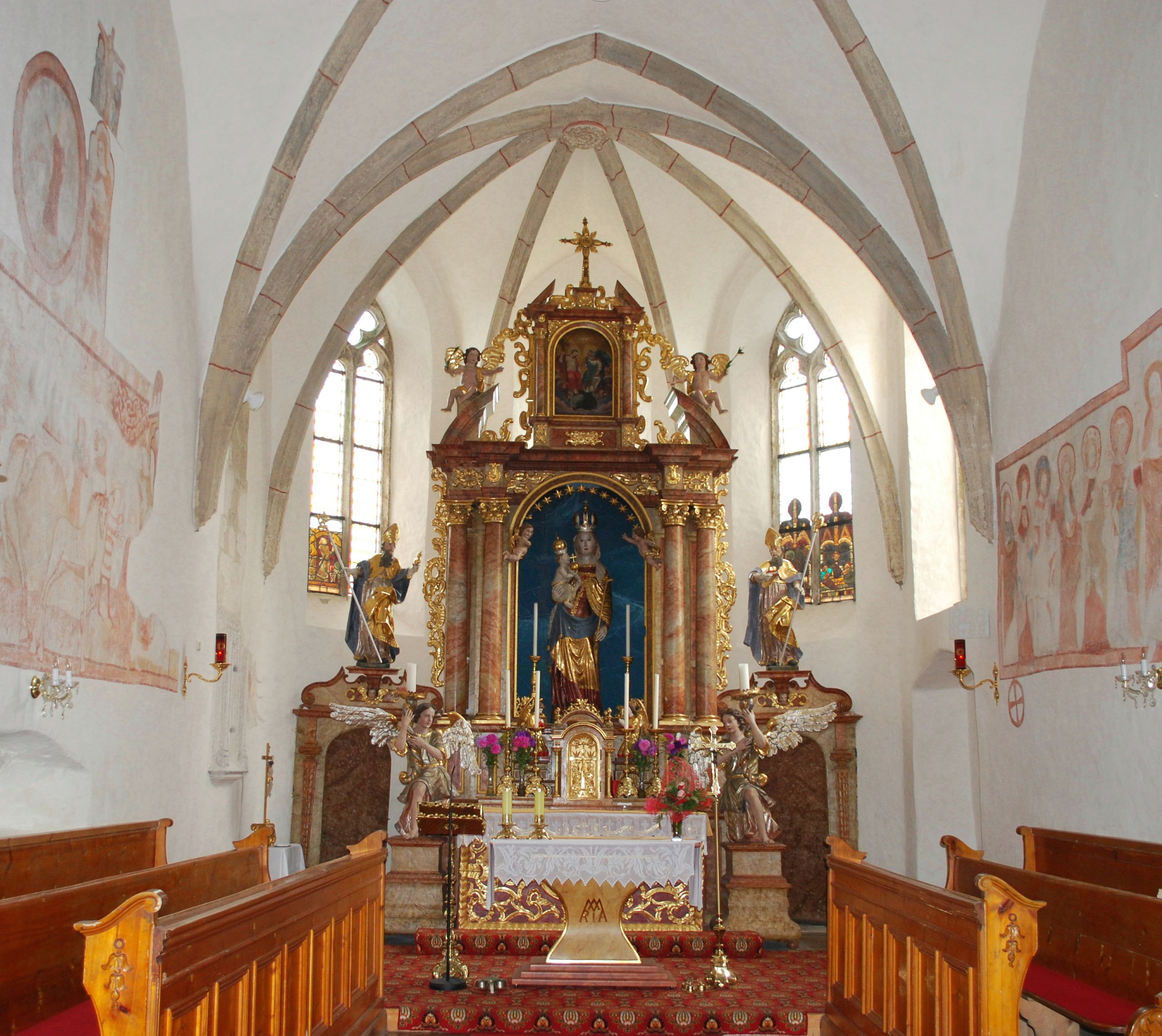 Atmosférický interiér gotického kostela s románským středem zdobí gotické nástěnné malby. Za pozornost stojí zejména pozdně gotická oltářní svatyně na malované predelle v boční kapli, pozdně gotické skleněné výplně, klenební žebra z pálené hlíny ("cihlová žebra") a gotická socha Matky Boží s Jezulátkem (kolem roku 1370) na barokním hlavním oltáři.