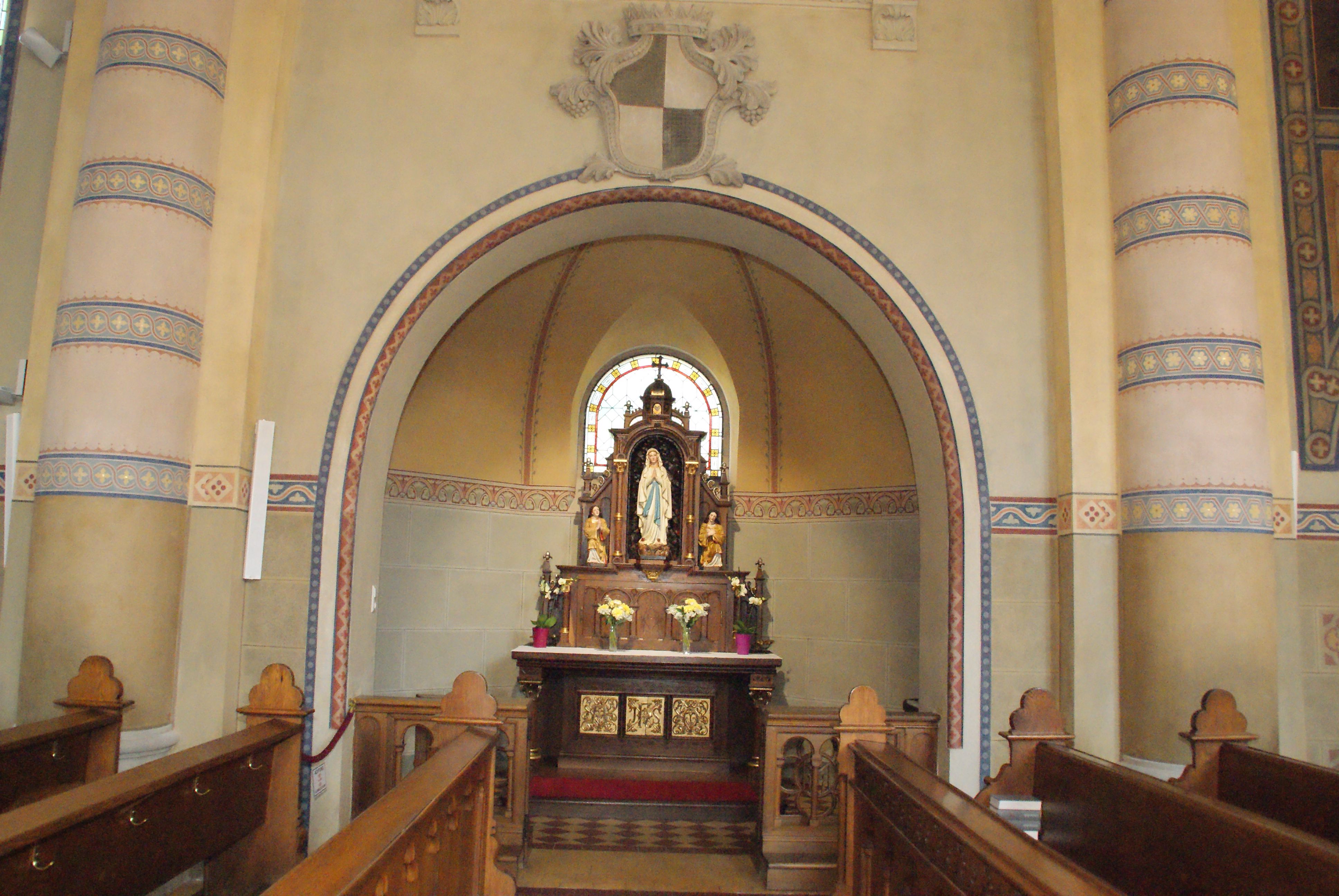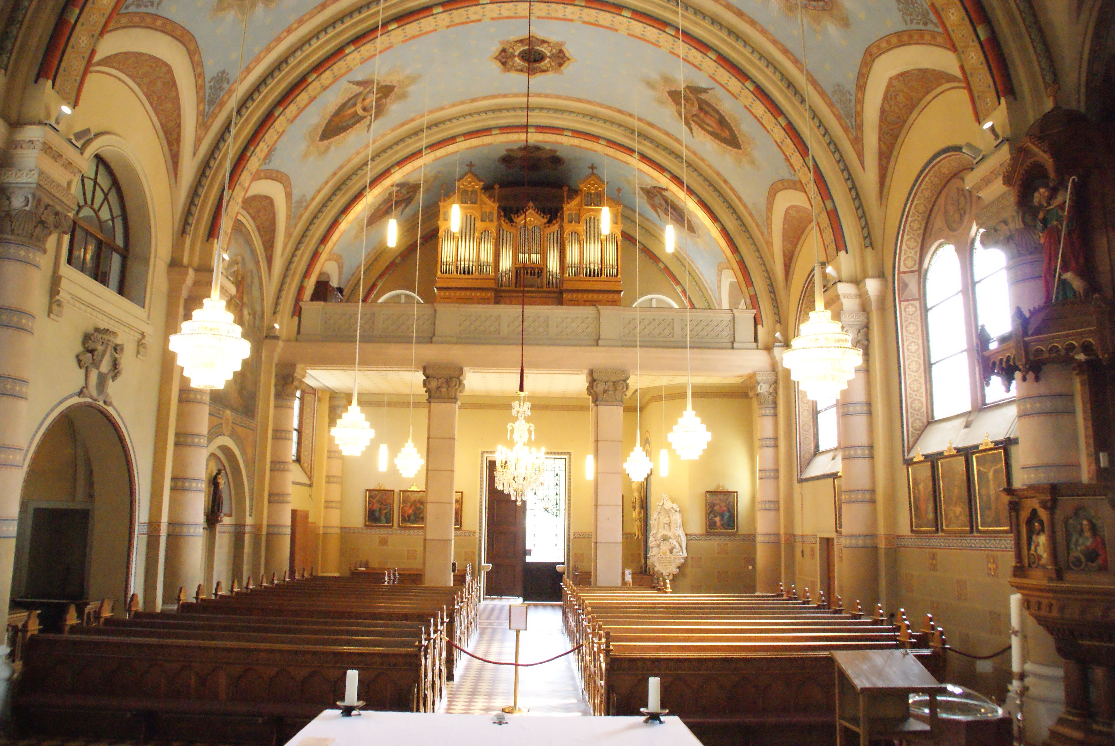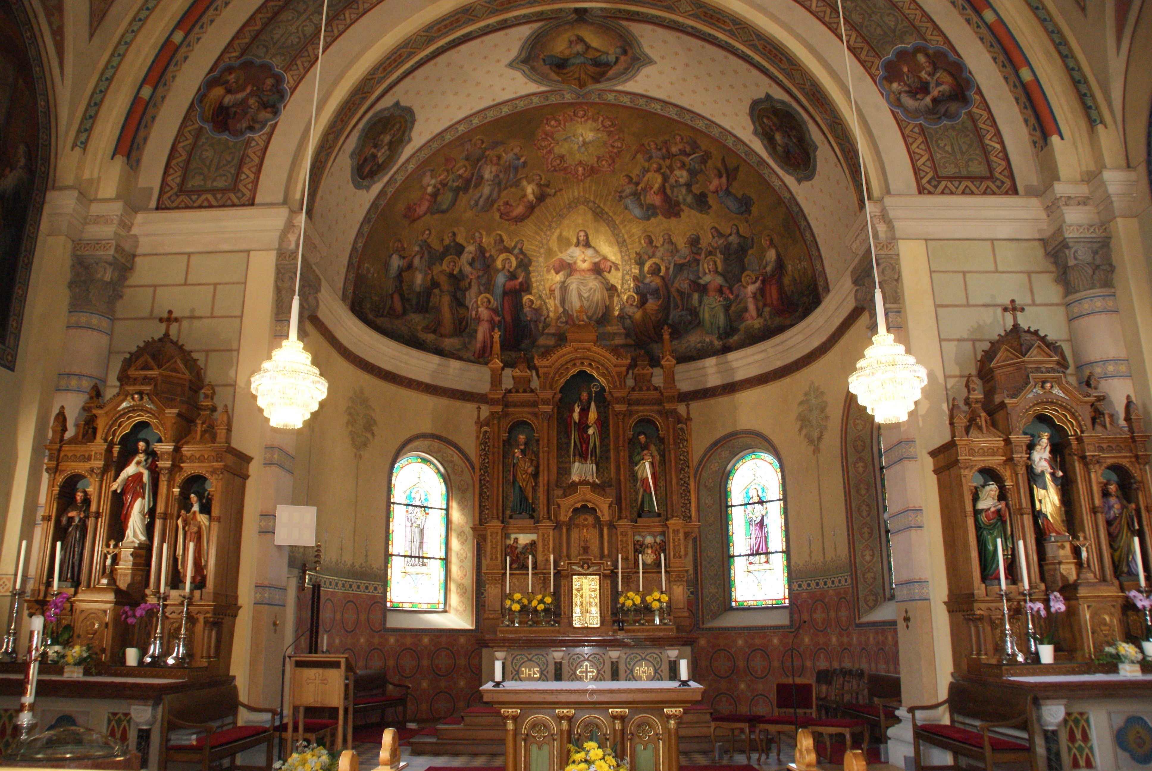 Současný kostel v novorománském slohu s byzantskými a maurskými prvky byl vysvěcen v roce 1907 a nahradil starý kostel, který zchátral v důsledku sesedání půdy. Zvláště působivé jsou zdobné malby v nazarénském stylu. Součástí interiéru kostela je také lurdský oltář v bočním výklenku, který je zhotoven jako obrácený oltář a o Velikonocích funguje jako Boží hrob.