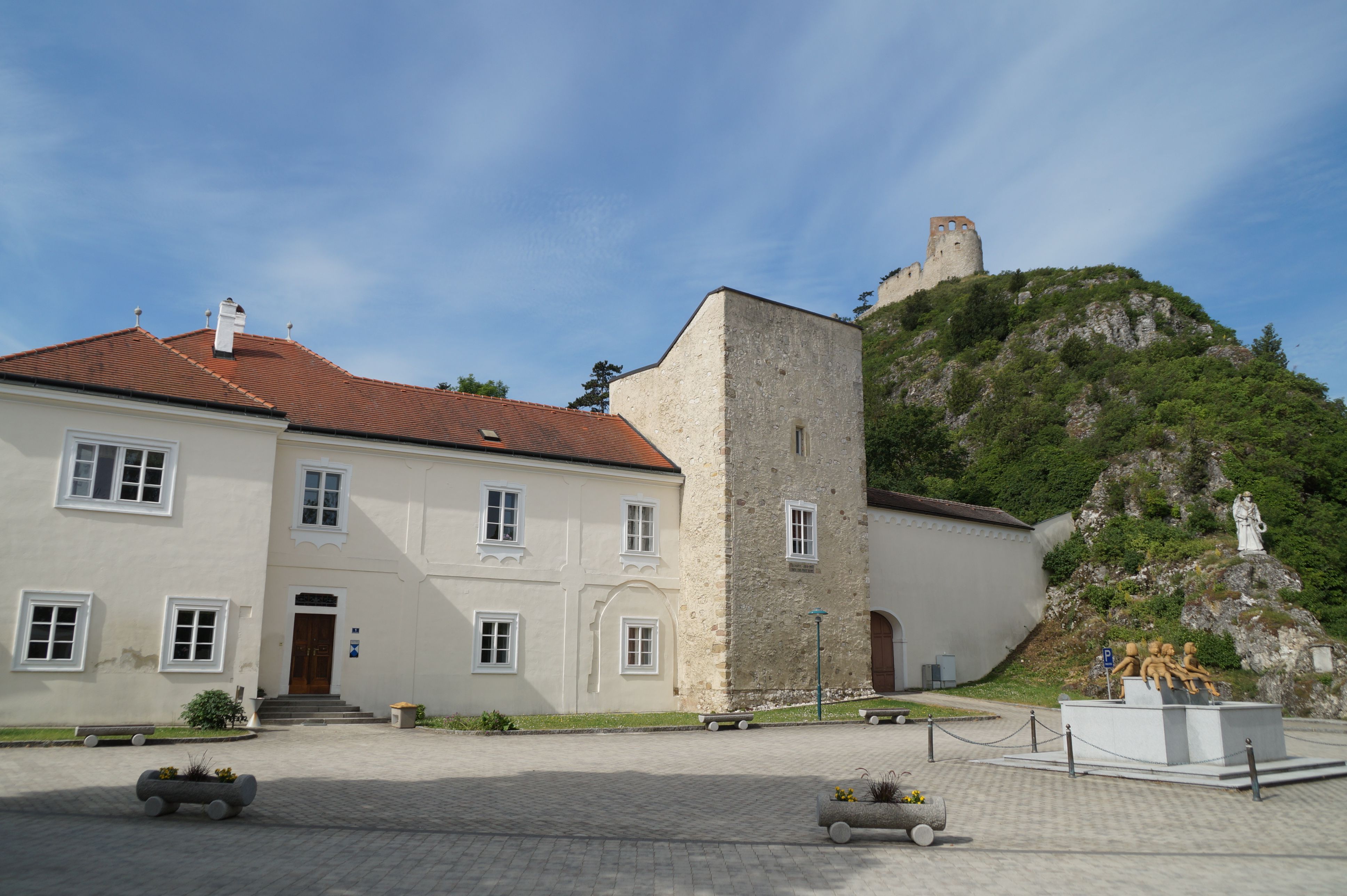 Vlevo před kostelem se nachází barokní fara se středověkou věží, jejíž nápis pod oknem naznačuje, že byla postavena kolem roku 1412.
