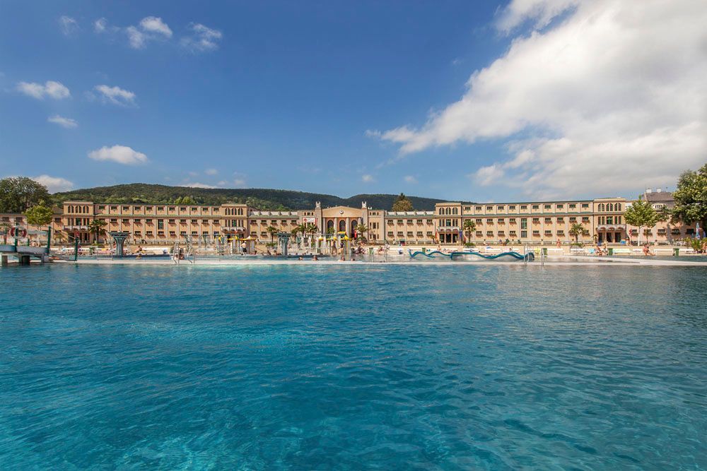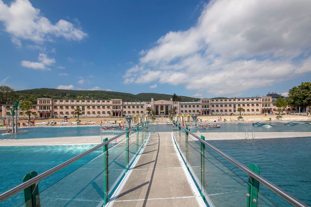 Dva padesátimetrové bazény, dva sirné bazény, masážní trysky v různých výškách, proudový kanál, podlahové gejzíry, masážní lehátka na palmovém ostrově, velký tobogán, široká skluzavka, skokanská věž, dětský bazén s vodním hřibem a skluzavkou zaručují dokonalou zábavu při koupání.